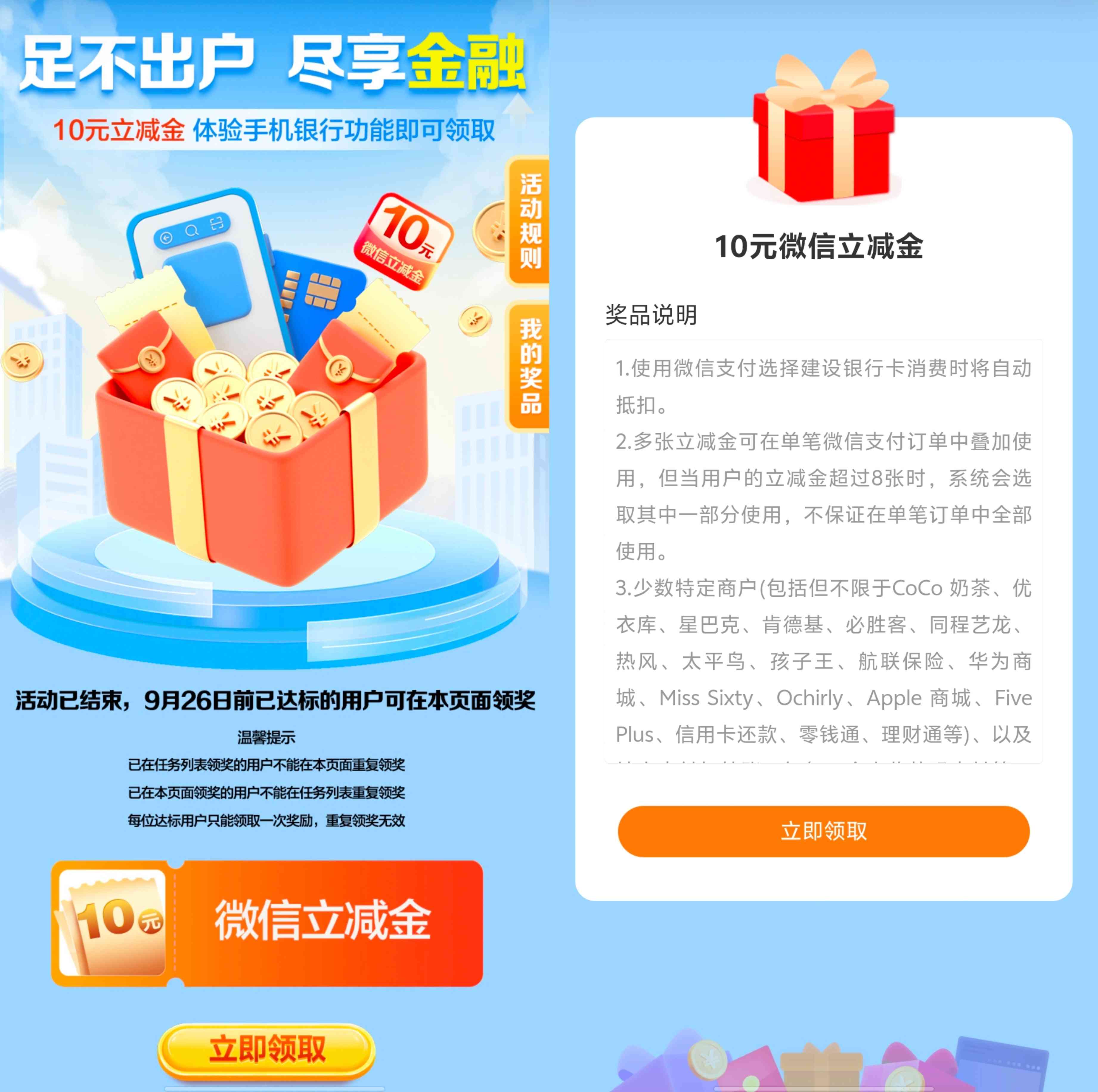 前面介绍过建行体验手机银行功能领取10元微信立减金的活动,当时活动介绍没多久后活动因为名额不足结束了,当时很多撸友选择购买基金来完成任务所以导致奖励没领取到,现在又补充了奖品数量,前面没领取的现在可以进入领取了,当时没参加活动的不用进去,活动可能随时没名额下架,看到的抓紧领取一下