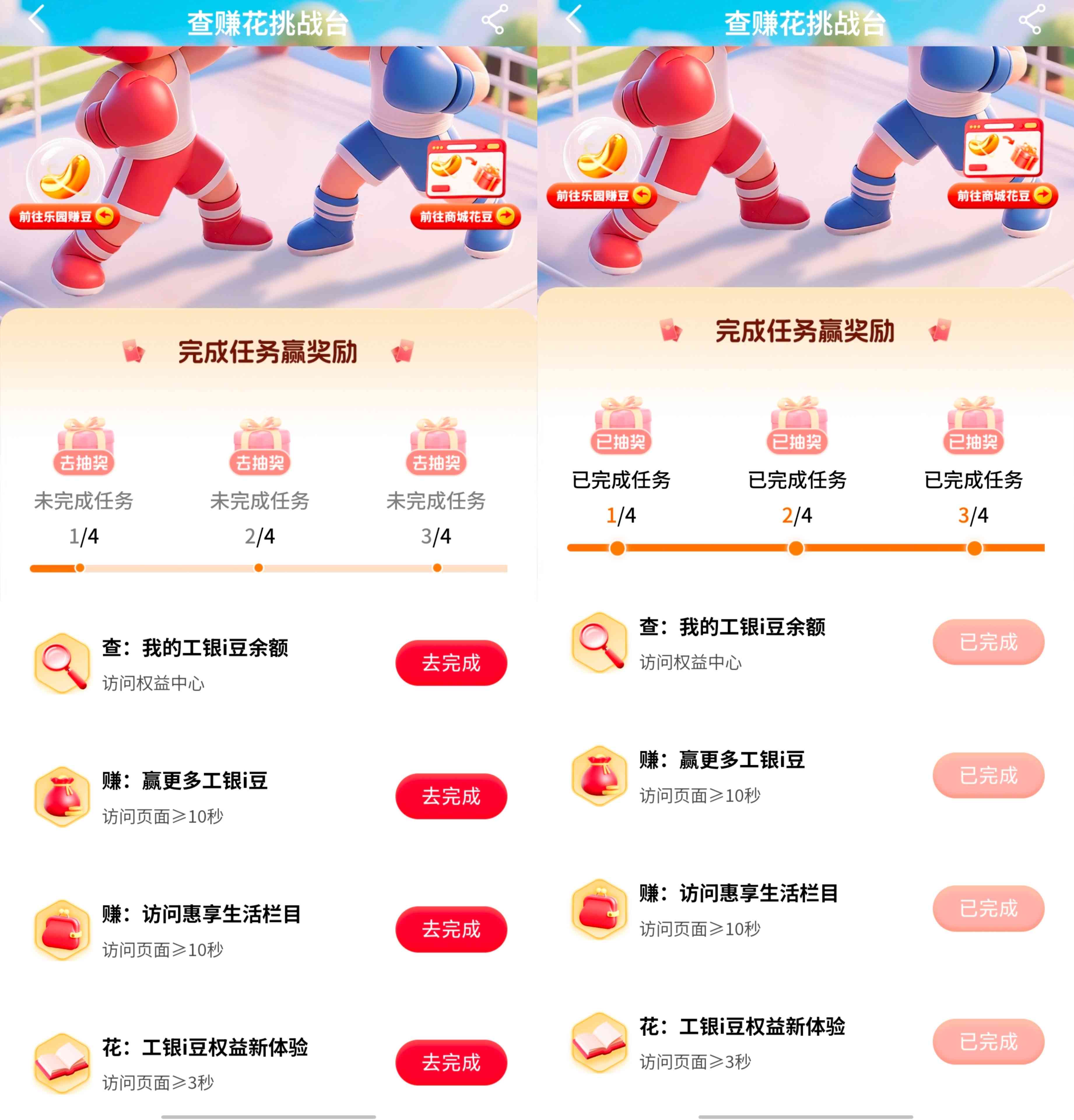 1;工商银行APP任务中心,任务里面有一个。享活动里面也有一个,享活动里面的是三个任务可抽奖三次,加上任务里面的一共四次抽奖机会,每次可抽2000个i豆,这里我是四次全中2000,一共是8000豆