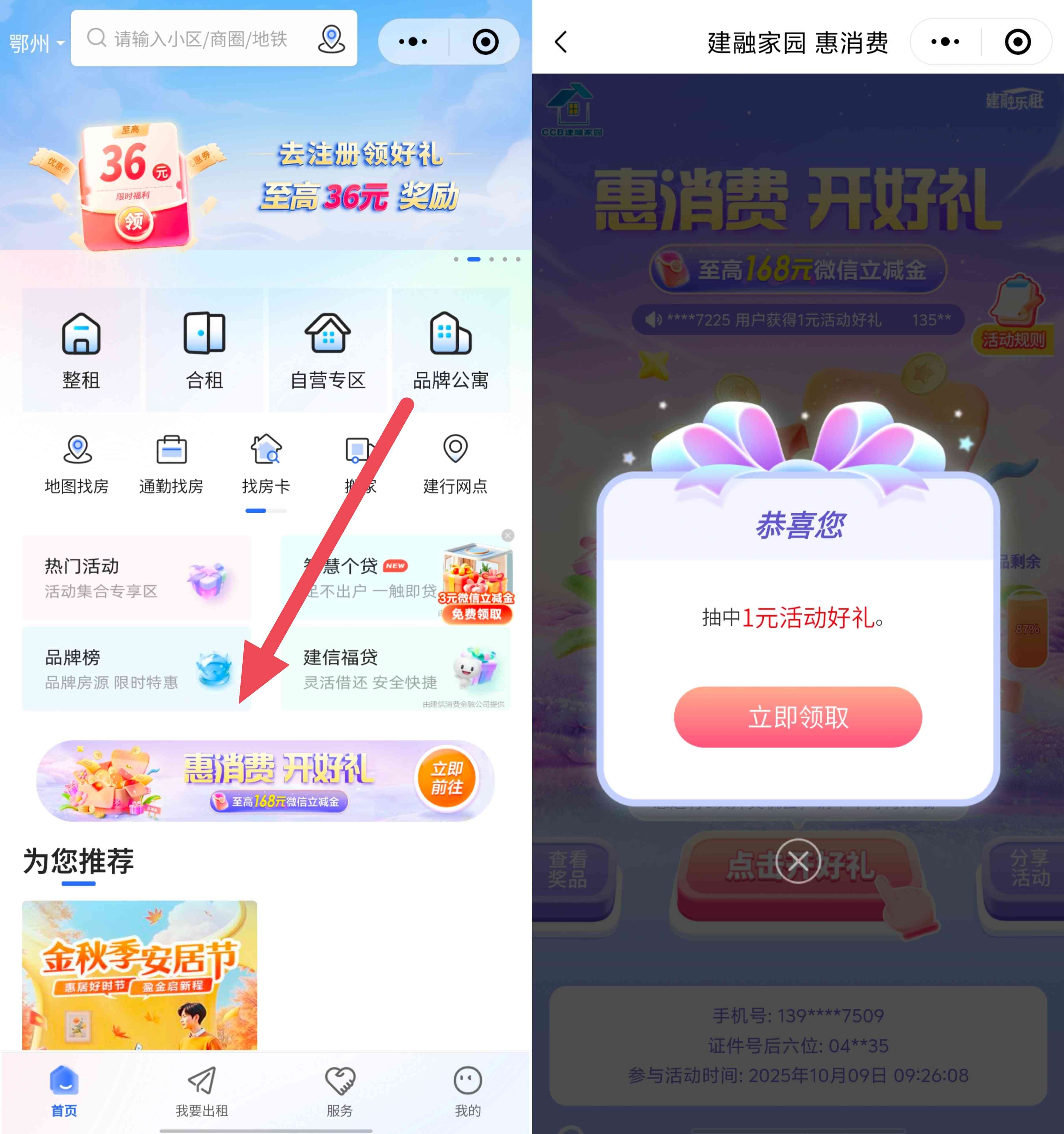 建设银行旗下平台建融家园新一期的惠消费开好礼的活动,用户参加活动每月进入可直接参加抽奖一次,奖品为最高168元微信立减金,如果以前没注册过建融家园的用户进入小程序注册后也可以抽最高36元微信立减金,建行用户可以参加一下
