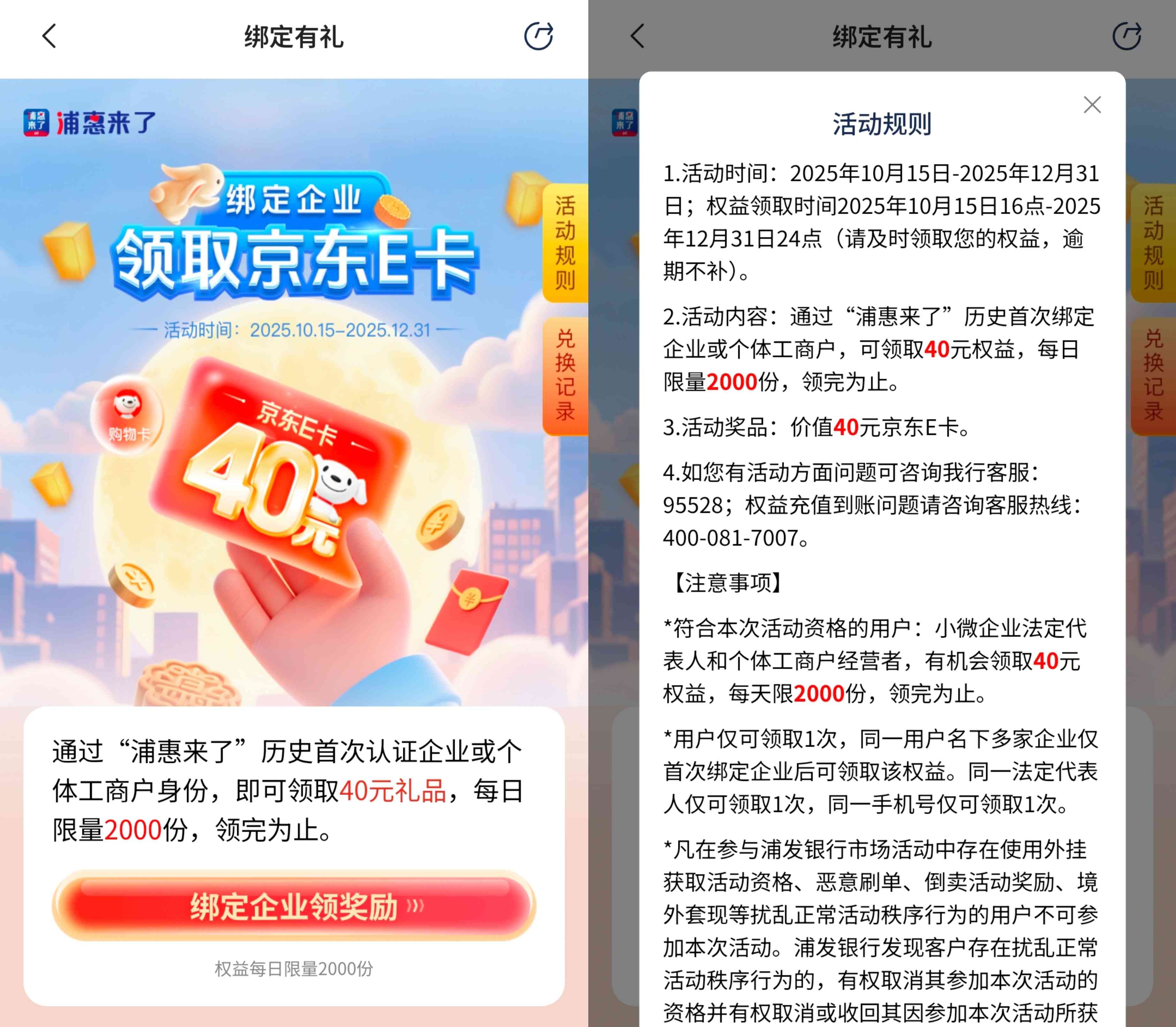 浦发银行旗下平台普惠来了的新用户绑定有礼的活动,活动是全国不限是不是浦发银行用户都可以参加,参加活动进入只需要是首次完成绑定营业执照就可以领取40元的京东E卡,营业执照不管是公司还是个体都可以,领取的京东E卡可以在【闲卡宝】微信公众号卖出变现