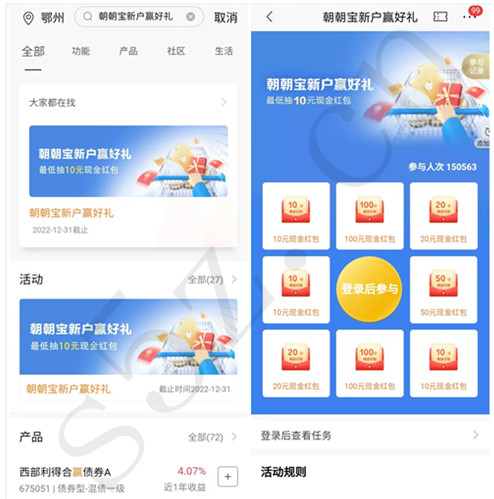 招商银行的信贷武林大会2022活动,活动一共有两个栏目,信用卡和信贷的,每个栏目有3道题目,全部答对可抽奖,题目挺简单的,亲测两次抽中2000微克黄金红包,可兑换到账户卖出变现,自行申请的电子账户也可以参加活动时间:截止到12月31日参与流...