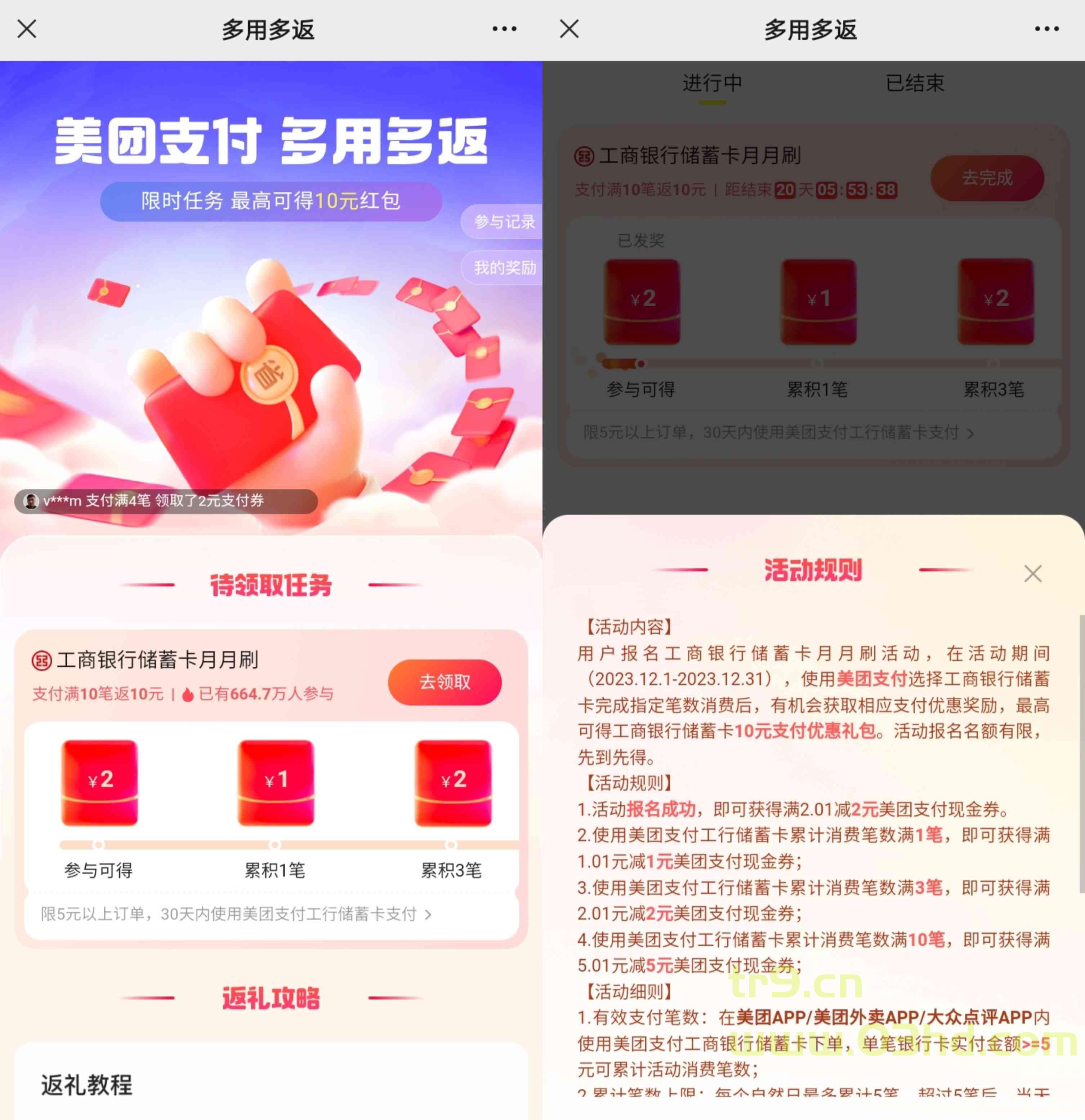 工商银行的美团支付多用多返活动,跟微信支付月月差不多,参与就可以领取2元的美团消费红包,30天内使用美团支付消费10笔可领取总计8元的美团消费红包,每笔消费金额需要大于5元