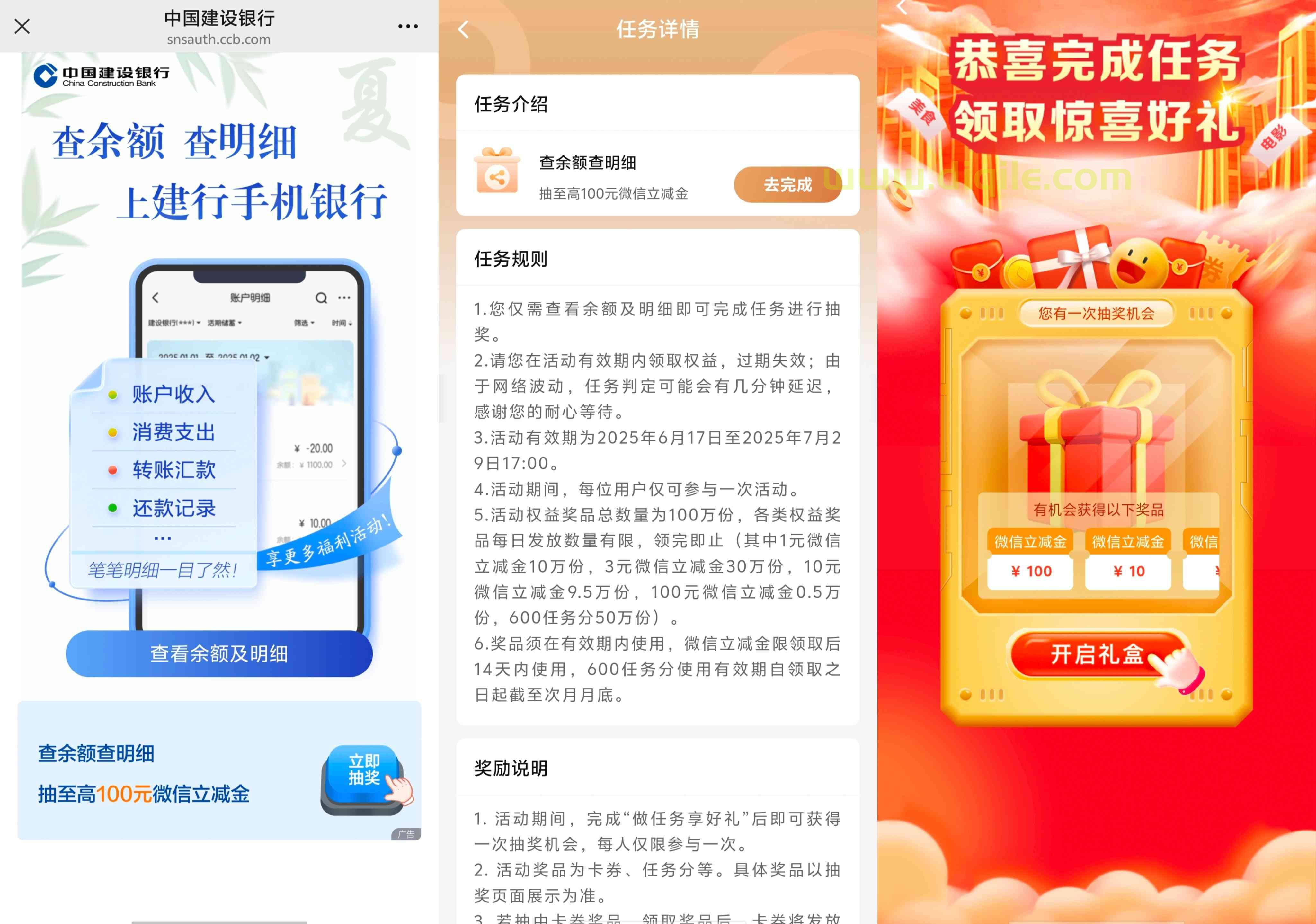 建设银行任务中心的一个盲盒任务活动,参加活动进入只需要完成简单的浏览任务后可抽奖一次,奖品为最高100元微信立减金,也有可能抽中积分,我就是抽中的600积分,积分可以在【我的】页面任务中心开盲盒抽奖,每以一千积分可抽奖一次,积分不够的可以完成本月的任务赚取积分后抽奖