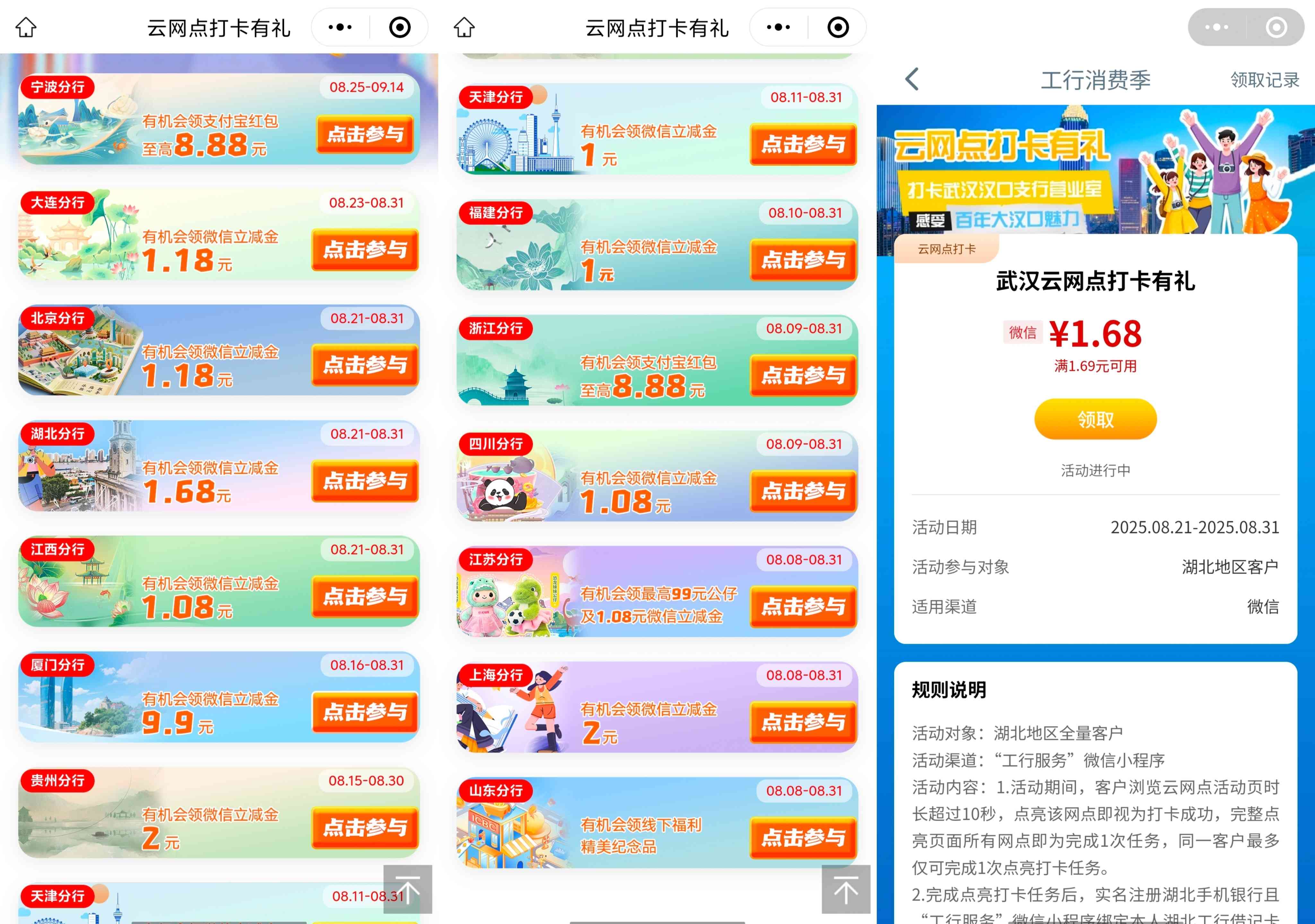 工商银行新一期的网点打卡有礼领微信立减金的活动,所谓的打卡就相当于是一个浏览任务,完成后就可以领取微信立减金,每个地区都有自己地区的活动,所以每个地区的奖品不同,为1~9元微信立减金和线下礼品,活动只能领取自己所在地区的微信立减金