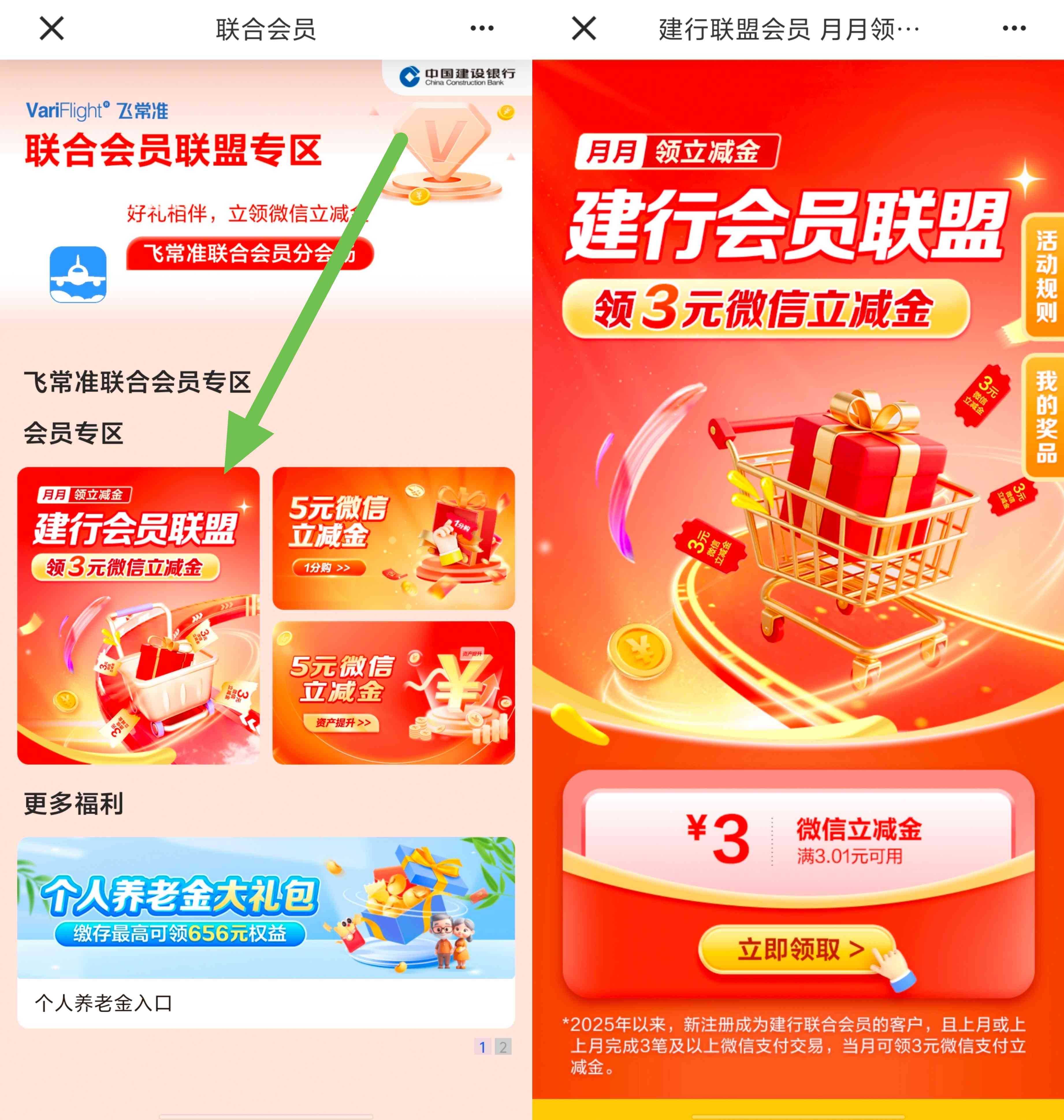 建设银行里一个联合会员的福利活动,参加活动进入联合会员页面可直接领取3元微信立减金,需要手动领取到微信,无门槛使用,有建行账户的可以看看