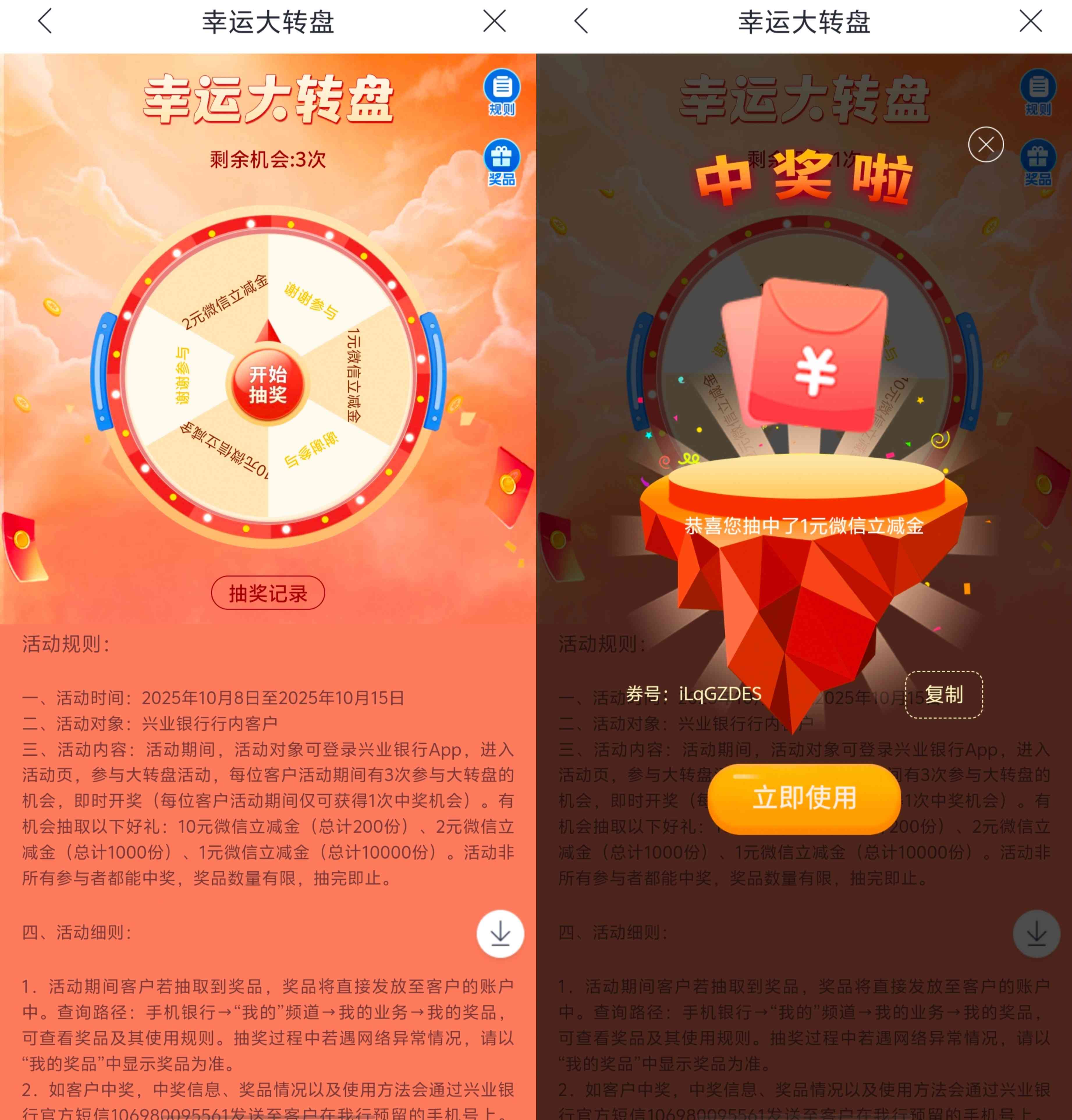 兴业银行的寒露节气礼抽奖活动,兴业银行用户参加活动进入可直接参加抽奖一次,奖品为1元、2元和10元三种面额的微信立减金,抽奖非必中,兴业银行用户可以自行试试运气