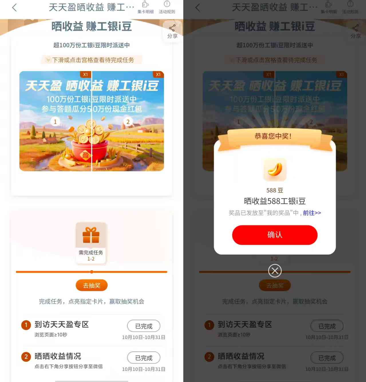 工商银行的天天盈晒收益抽奖的活动,参加活动进入需要完成两个简单的任务,一个时访问天天盈页面浏览10秒,一个是分享,分享任务可以是假分享,完成后可以抽奖一次,亲测588个i豆,价值0.5元,可以在【工银微金融】微信小程序兑换微信立减金