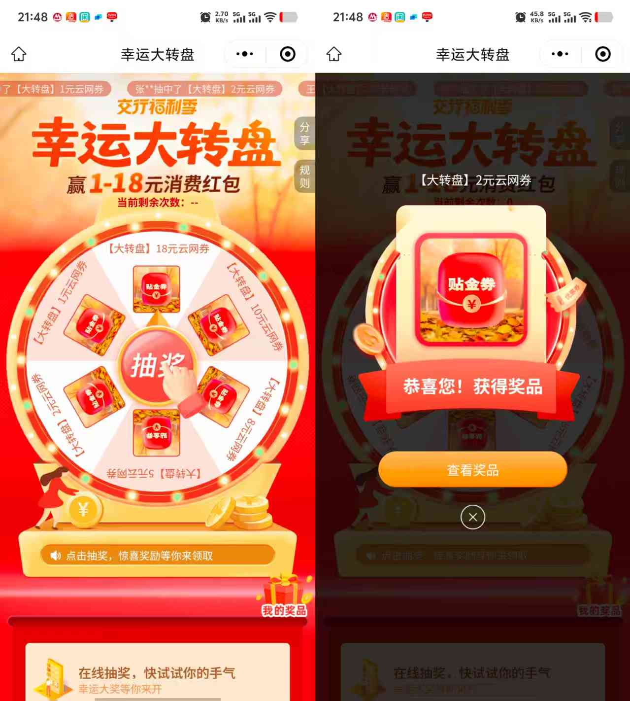交通银行的微信小程序的幸运大转盘的活动,参加活动进入活动页面报名后可直接抽奖一次,奖品为1~18元的支付立减金,需要使用交通银行APP线下扫码或者被扫支付可立减