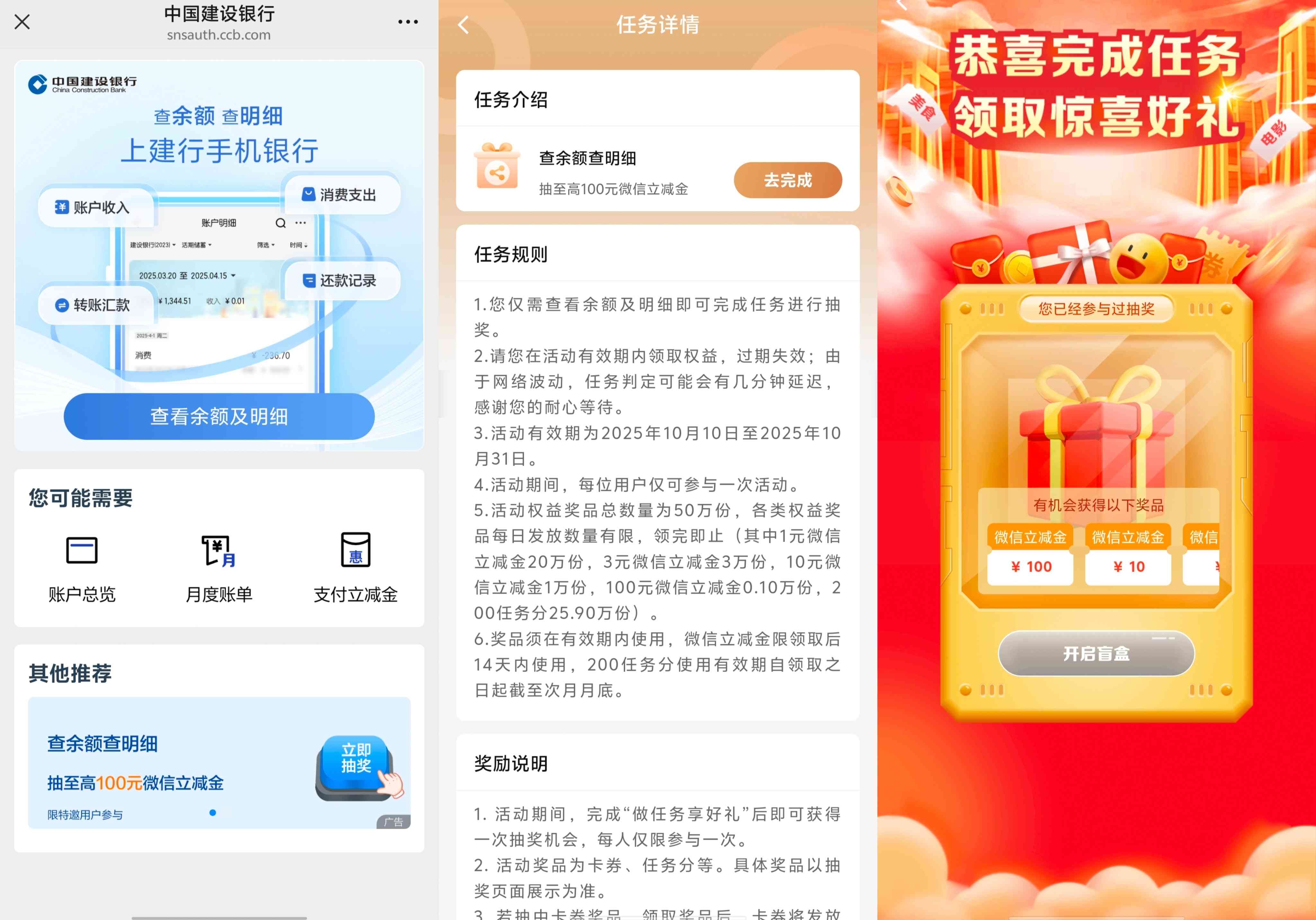 建设银行10月份新一期查余额抽奖的活动,参加活动进入相当于是需要完成一个简单浏览余额明细页面的浏览任务后可以抽奖一次,奖品为最高100元微信立减金,抽奖非必中微信立减金,可能会抽中积分,积分也可以在任务中心参加抽奖,每一千积分可抽奖一次,积分不够的可以完成页面任务获得积分