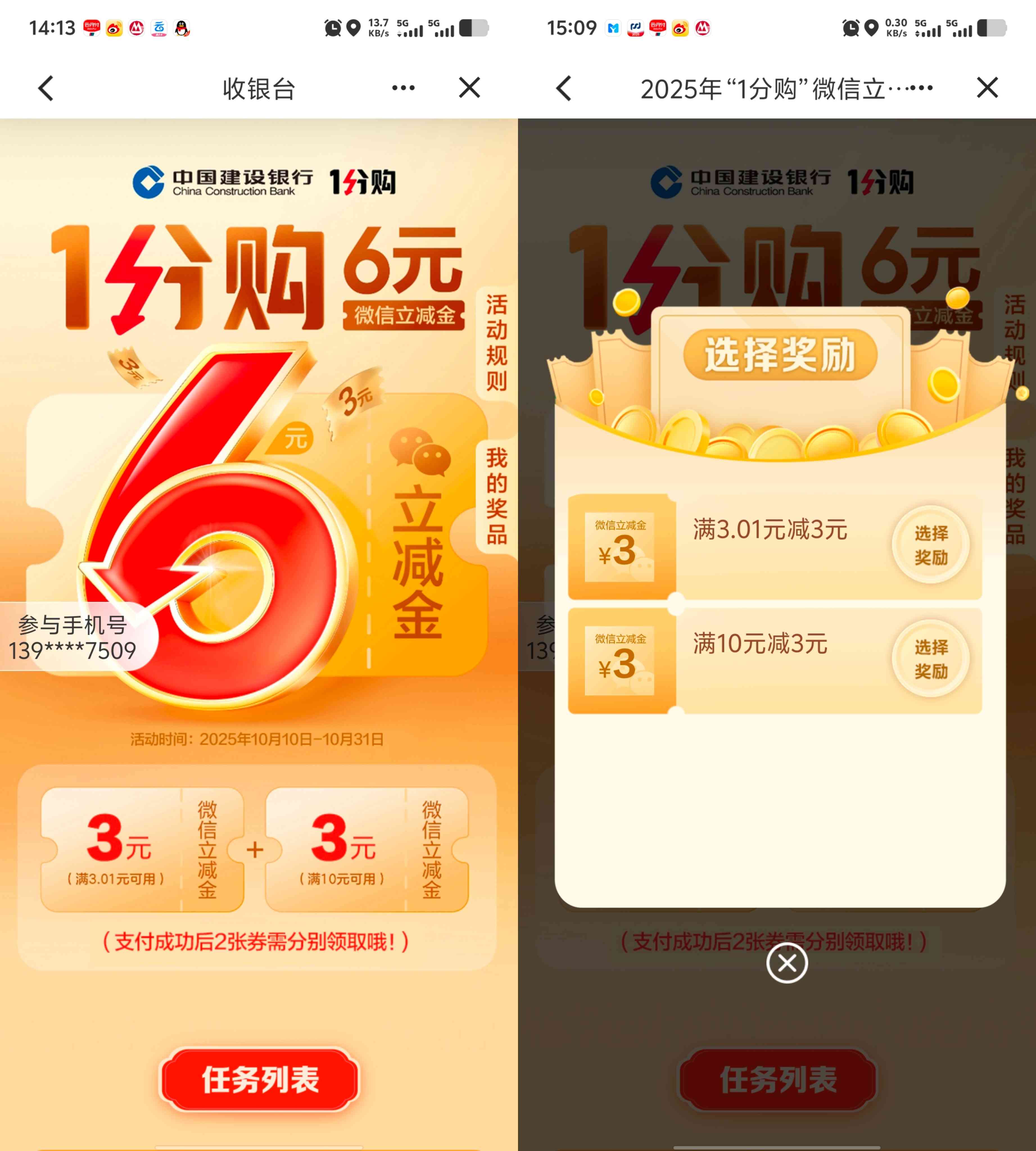 建设银行的1分购6元微信立减金的活动,参加活动进入只需要支付1分钱就可以购买6元的微信立减金,里面包含两个3元的,活动确实是个好活动,不过我参加的时候遇到过两个问题,一个是提示参加人数过多,一个是参与信息与参数不符,当时我是先清除了建行APP的数据缓存,这个可以在APP设置里清除,然后卸载APP后重新下载的,再进入提示参加人数过多是点击右上角的三点刷新了几次就可以了,据撸友反馈这个方法行的通,有建行账户的可以看看