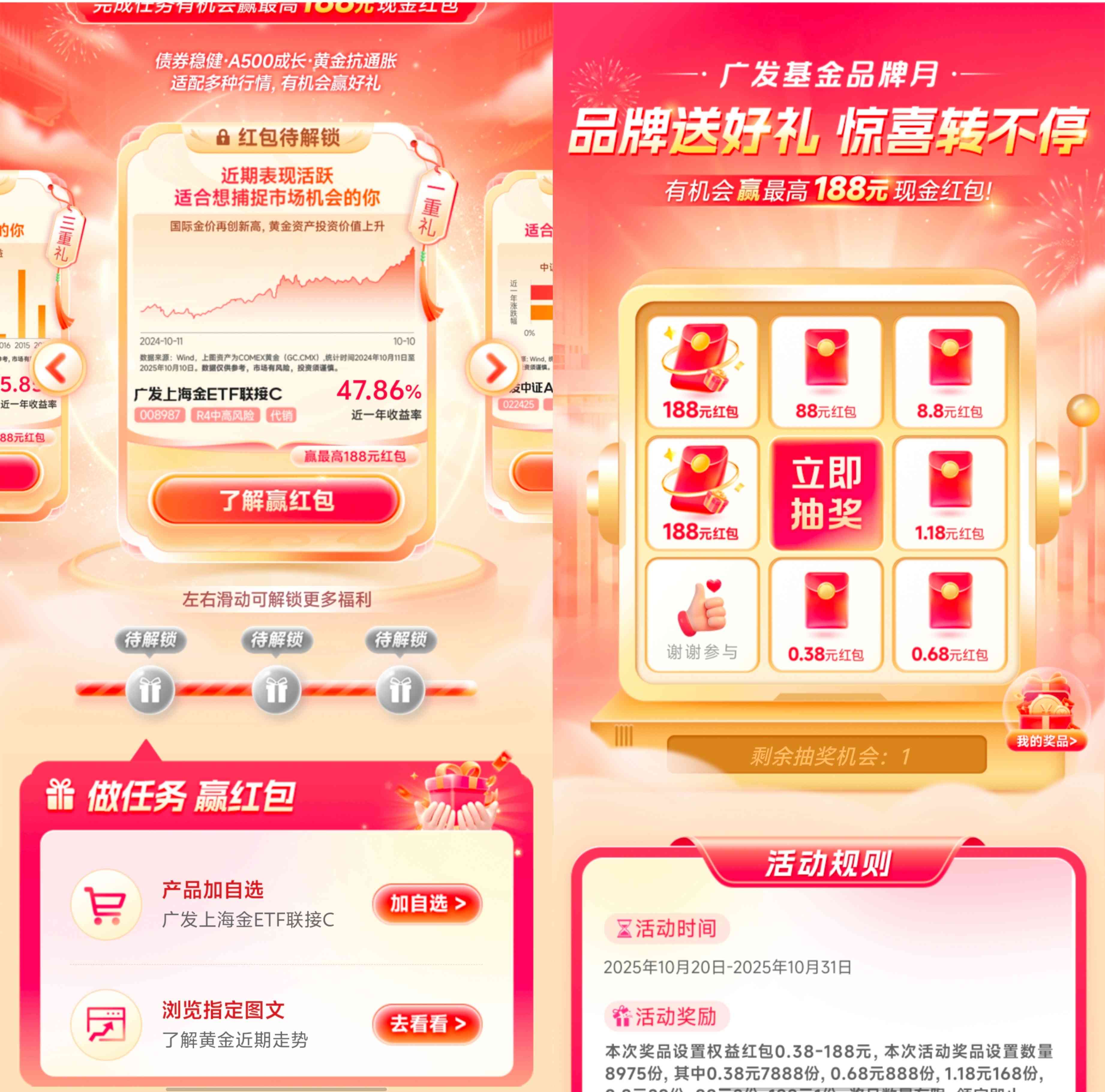 广发基金在光大银行举办的活动,活动一共有三个小活动,每个小活动都有两个任务,一个加基金自选和一个浏览,完成后可抽奖一次,一共三次抽奖机会,奖品为0.38~188元现金红包,抽奖非必中,有兴趣的可以看看