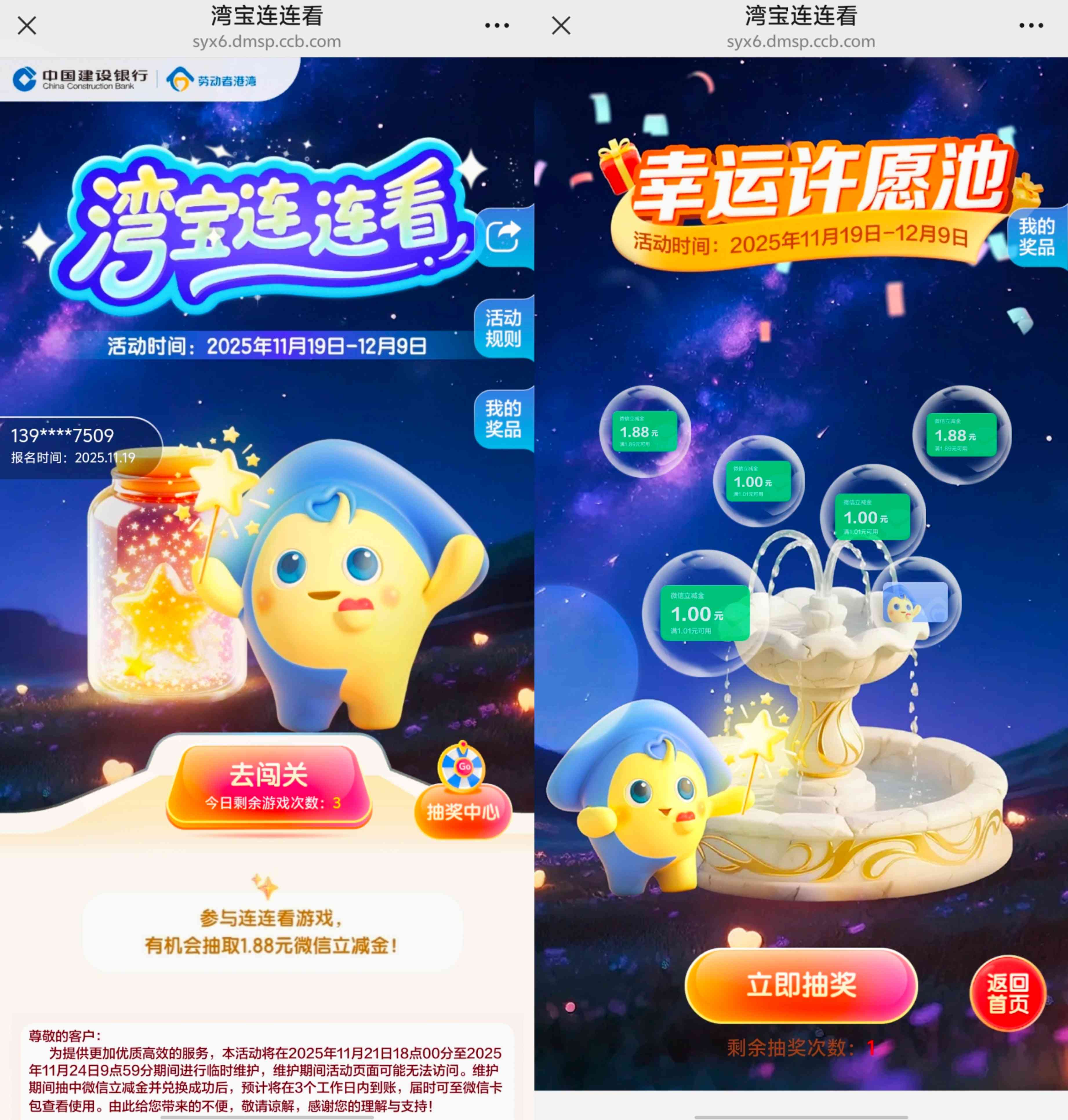 建设银行的塆宝连连的活动,参加活动需要一个连线的游戏,6张图三组连对就可以抽奖一次,可以根据背景连线即可,奖品为1~1.88元微信立减金,抽奖非必中,有兴趣的可以看看