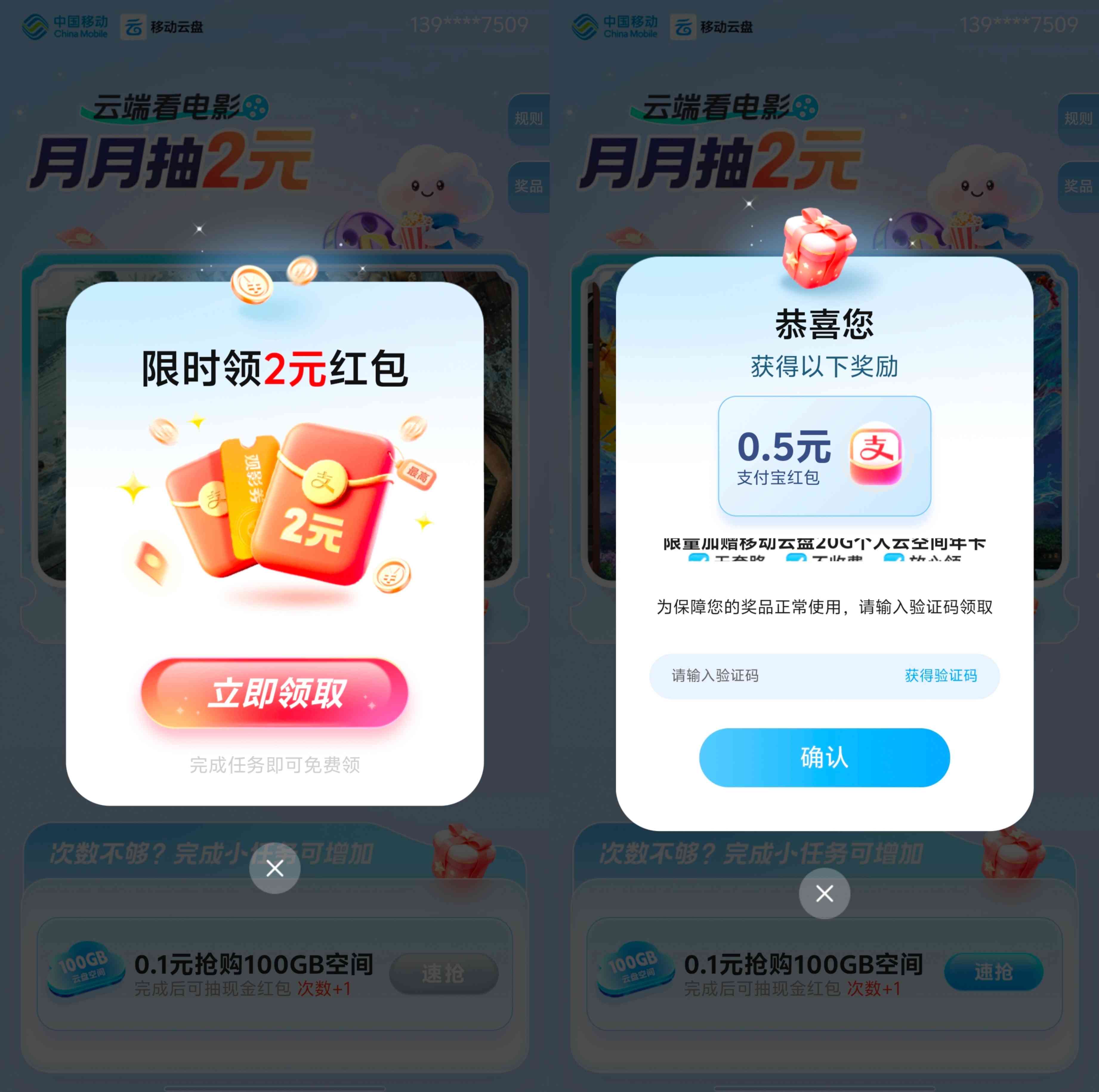 中国移动的云端看电影月月抽2元支付宝立减金的活动,参加活动进入一共有两个任务,一个是领取观影券,一个是支付1毛钱购买100G空间,每完成一个可抽奖一次,奖品为2元的支付宝立减金,领取后直接发放到支付宝