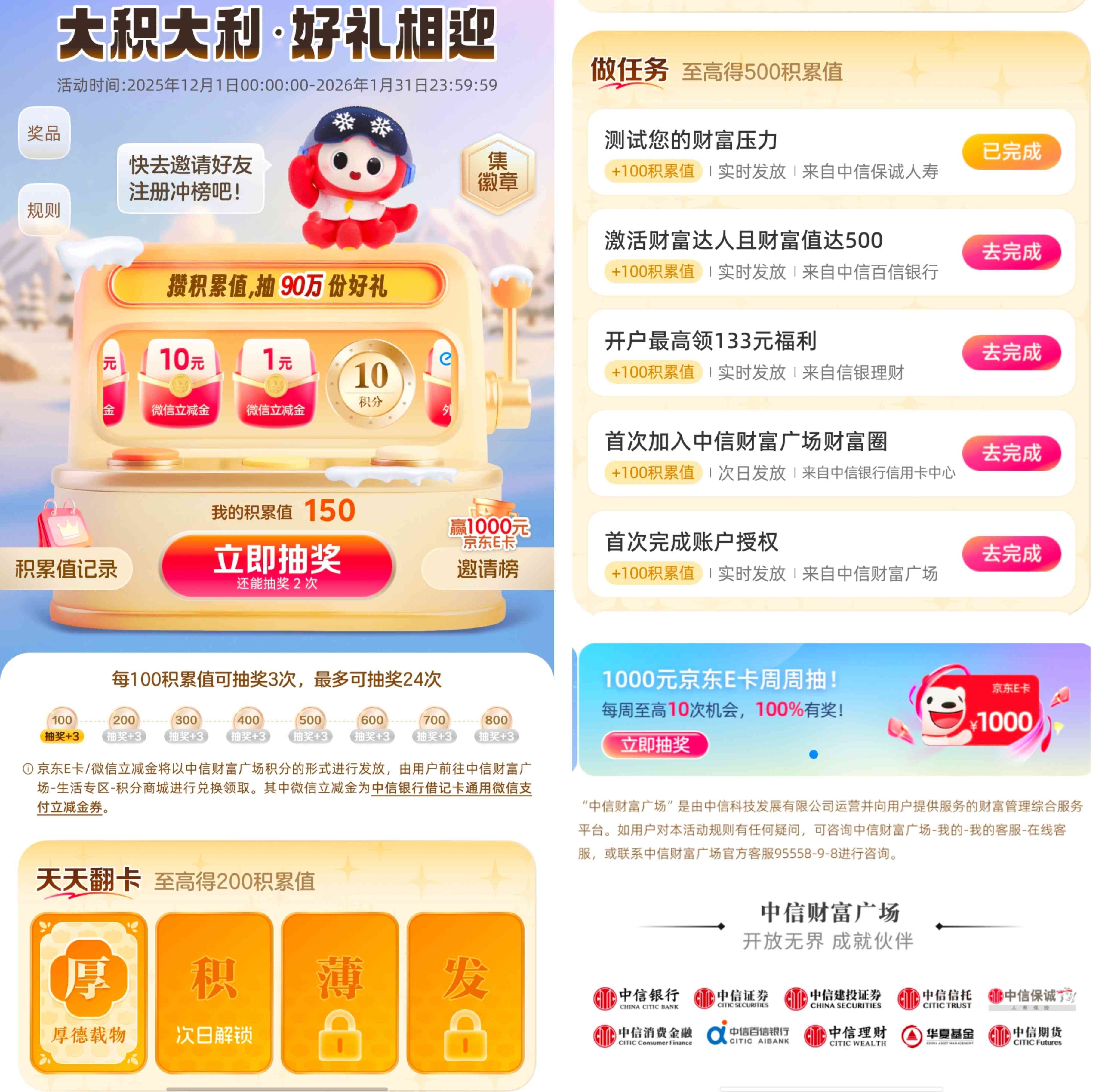 中信银行的大积大利好礼相迎的活动,参加活动进入是需要通过活动页面任务获得积累值,每获得一百积累值可抽奖三次,奖品为最高100元的微信立减金和一些卡券等奖品,通过签到每次可获得两百值,签到限获得两百,另外还有几个其他的任务,每个可以获得100值,有中信银行账户的可以看看