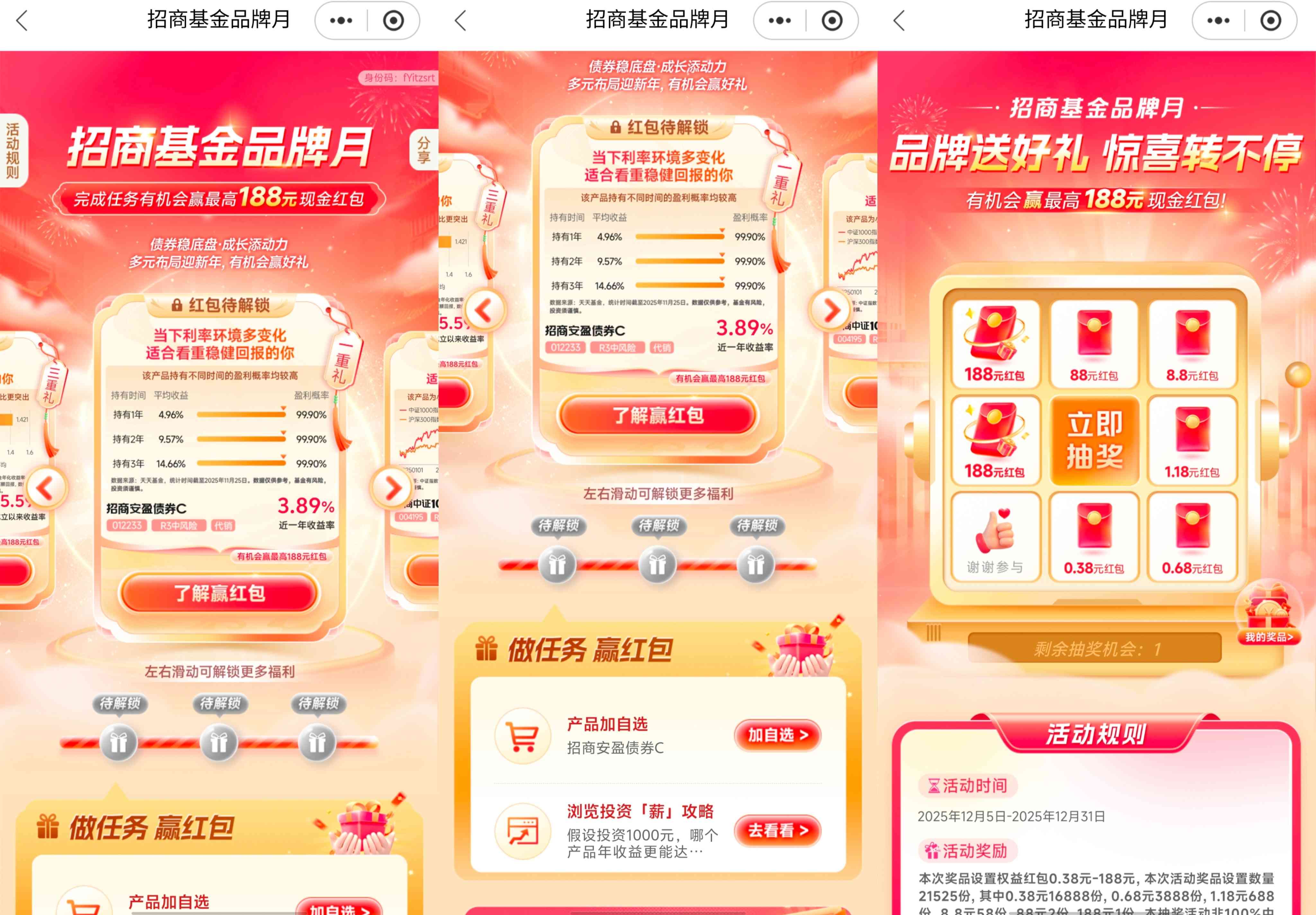 兴业银行的招商基金品牌月的活动,活动一共有三个抽奖,每个抽奖都有两个简单的任务,比如加基金自选和浏览,完成后可抽奖,奖品为最高188元的微信现金红包,抽中的现金红包需要复制兑换码在光彩礼遇微信公众号兑换,光大用户可以试试运气