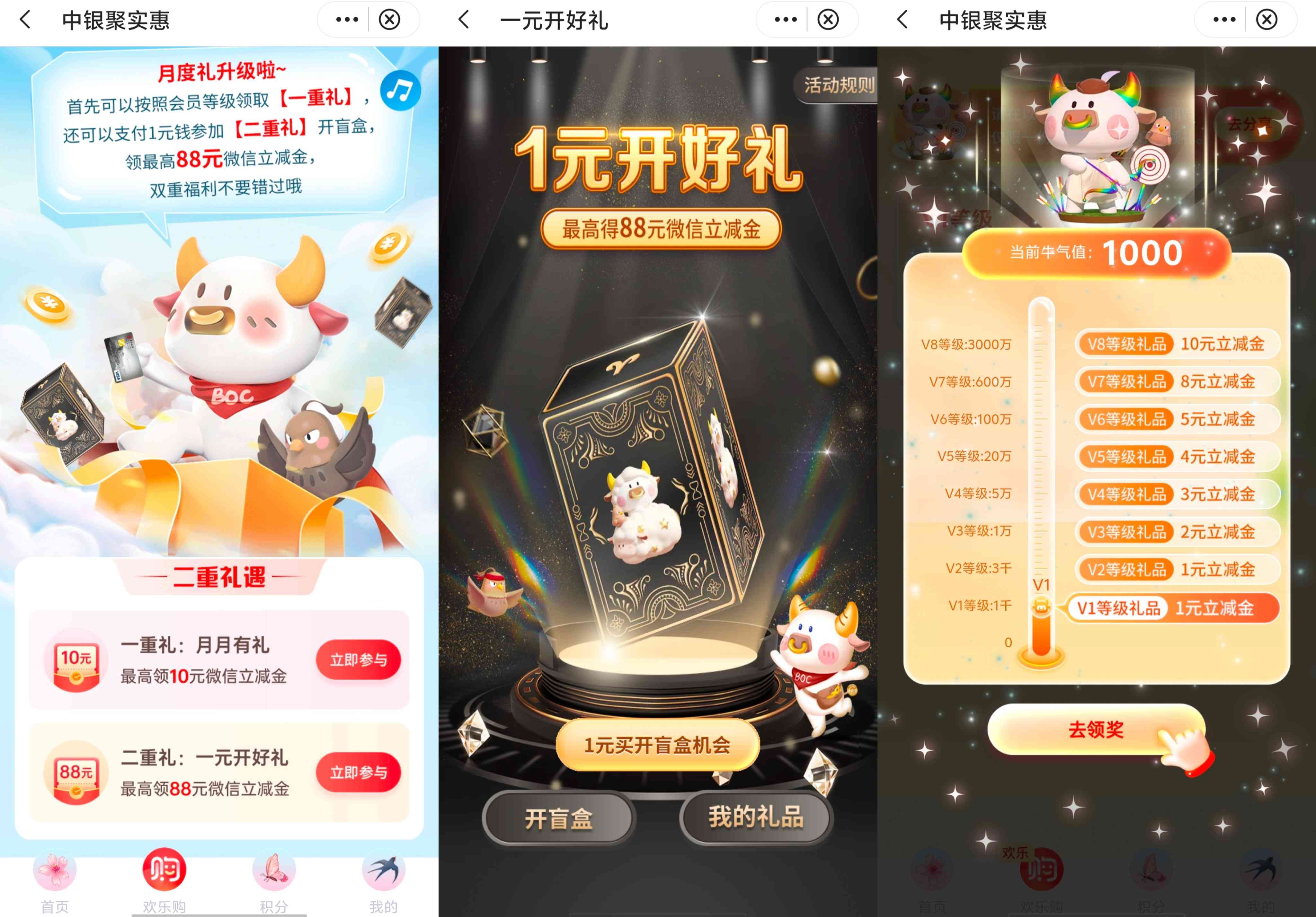 中国银行的活动,活动有两种模式,一种是根据牛气值等级领取1~10元的微信立减金,一般都是可以领取最低1元的,另一种模式是需要支付1元钱开盲盒抽2~88元微信立减金,最低2元,这个也不会亏本,不嫌少的可以试试运气