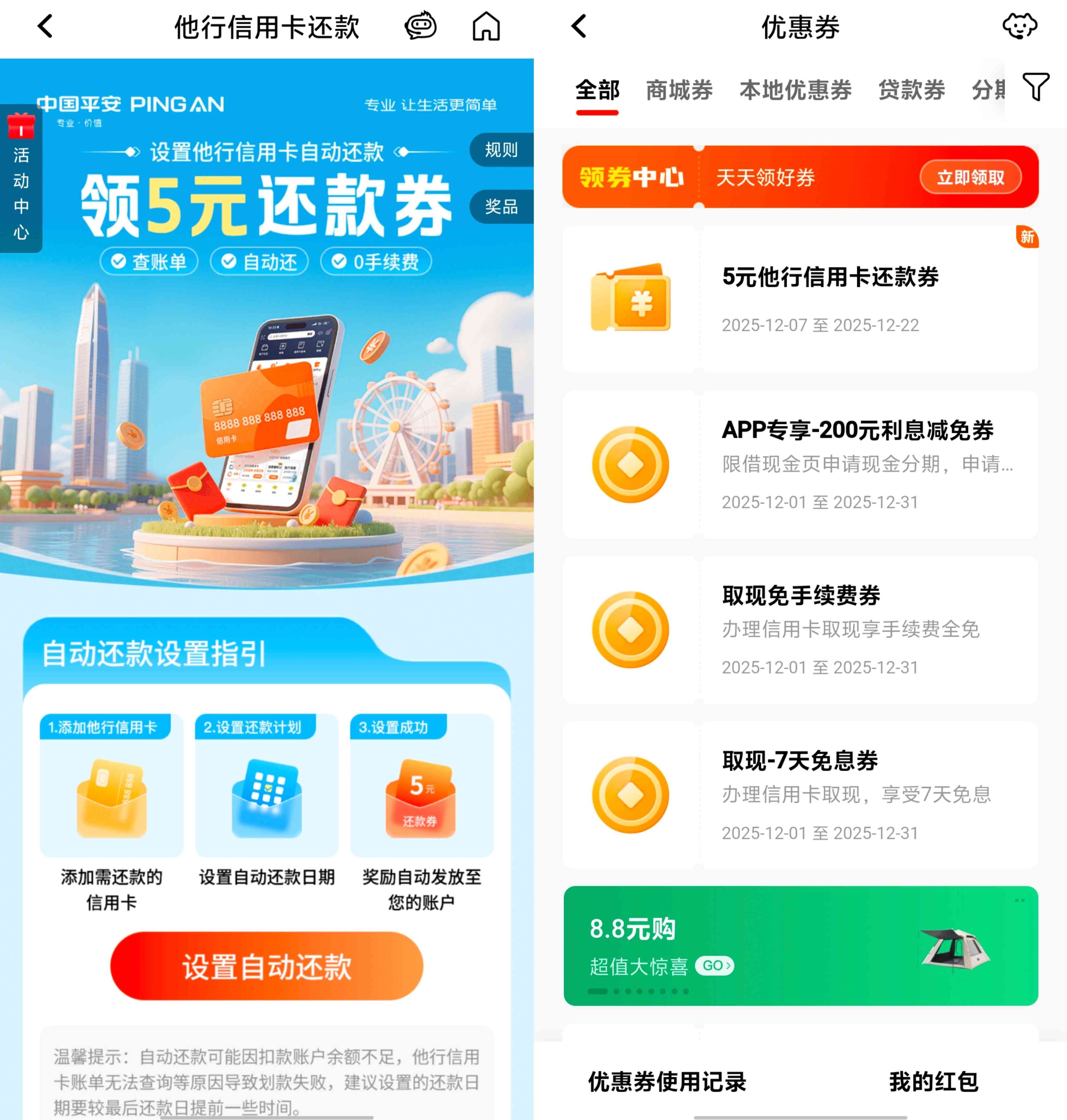 平安银行的活动,参加活动需要持有平安银行储蓄卡和其他银行信用卡,储蓄卡应该是电子账户也可以,这个需要自己测试,我是用的一类卡,参加活动需要在活动页面设置一下其他银行信用卡自动还款的功能就可能领取5元的还款券,这个券也是还其他银行信用卡才能用,券是设置完成后自动到账,可以手动还他行信用卡无门槛使用,满足条件的可以试试