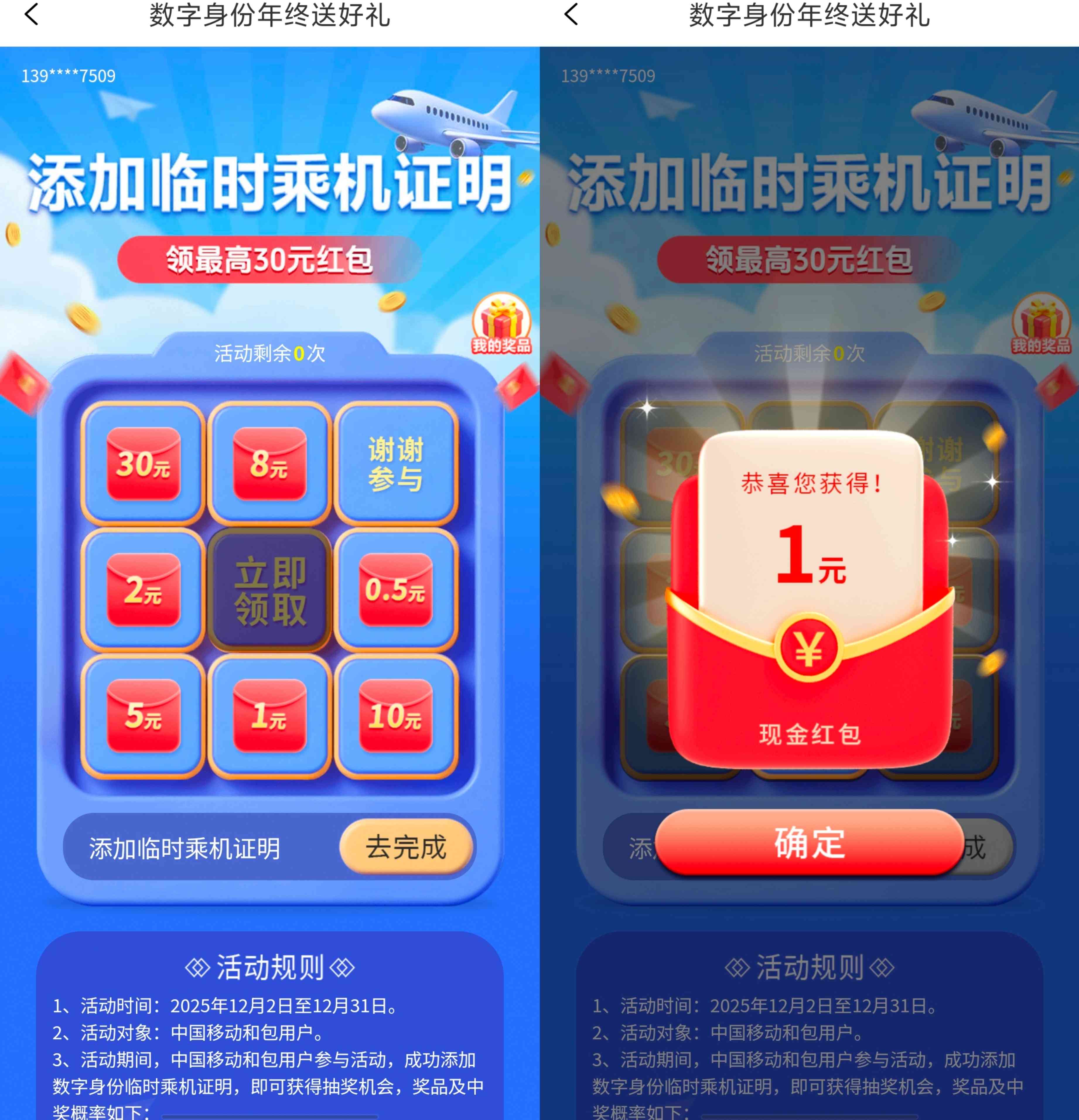 中国移动旗下支付平台和包的添加临时乘机证明抽现金红包的活动,参加活动进入只需要根据活动流程完成添加临时乘机证明就可以抽奖一次,所谓的添加临时乘机证明其实就是提交一下资料,奖品为1~30元的现金红包,红包可以直接提现到银行卡