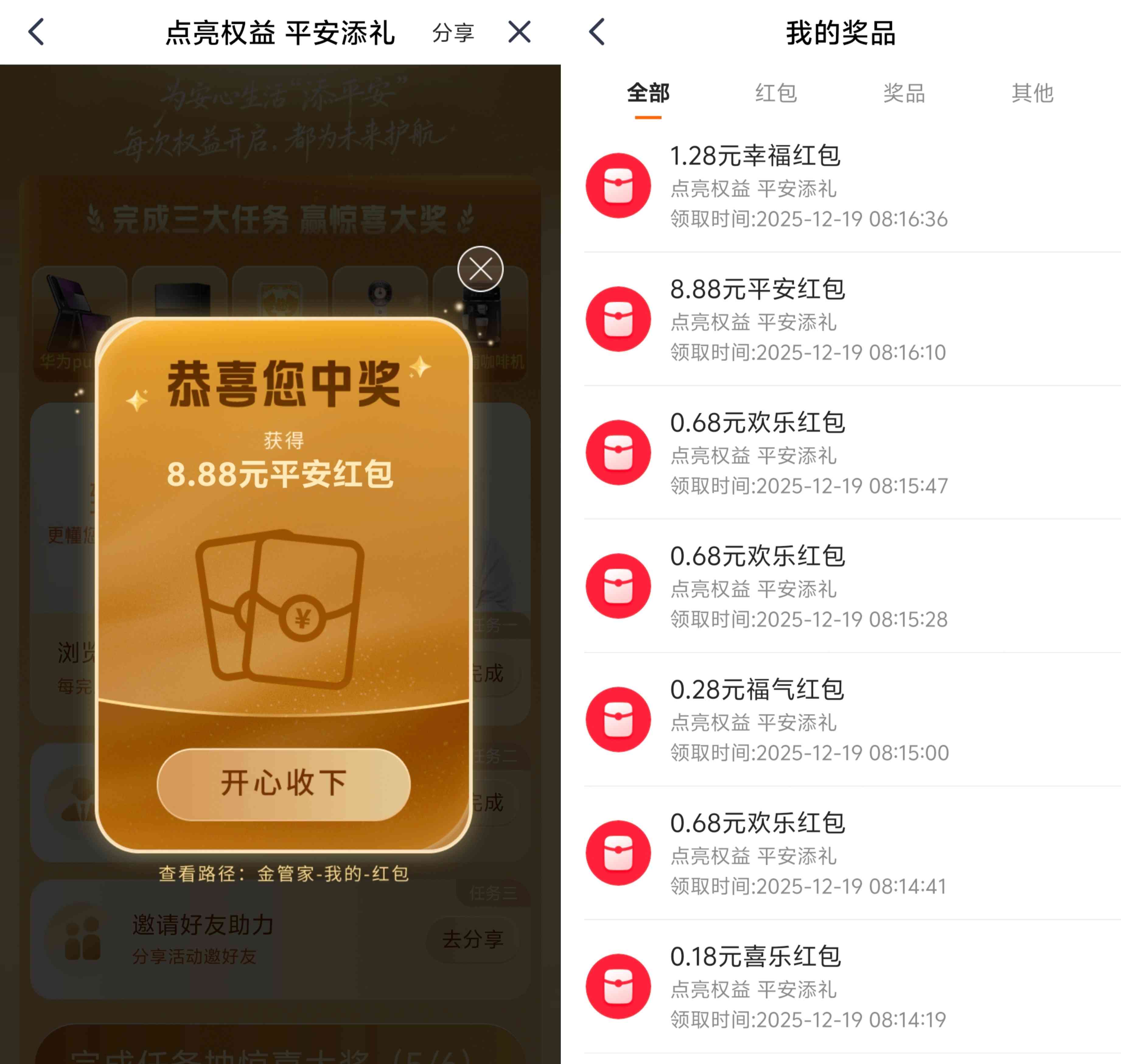 平安集团旗下平台平安金管家APP的点亮权益平安添礼的活动,参加活动进入一共有6个任务,四个浏览,一个预约代理人讲解和一个邀请好友助力,预约只需要提交联系电话,邀请好友助力只需要分享就可以,全部完成可抽奖6次,我是一共抽中十多块,红包到账在24小时内,到账后需要先提到旺财账户,这个是48到旺财账户,然后才可以提现到银行卡,注意要先绑卡注册旺财账户再去提红包