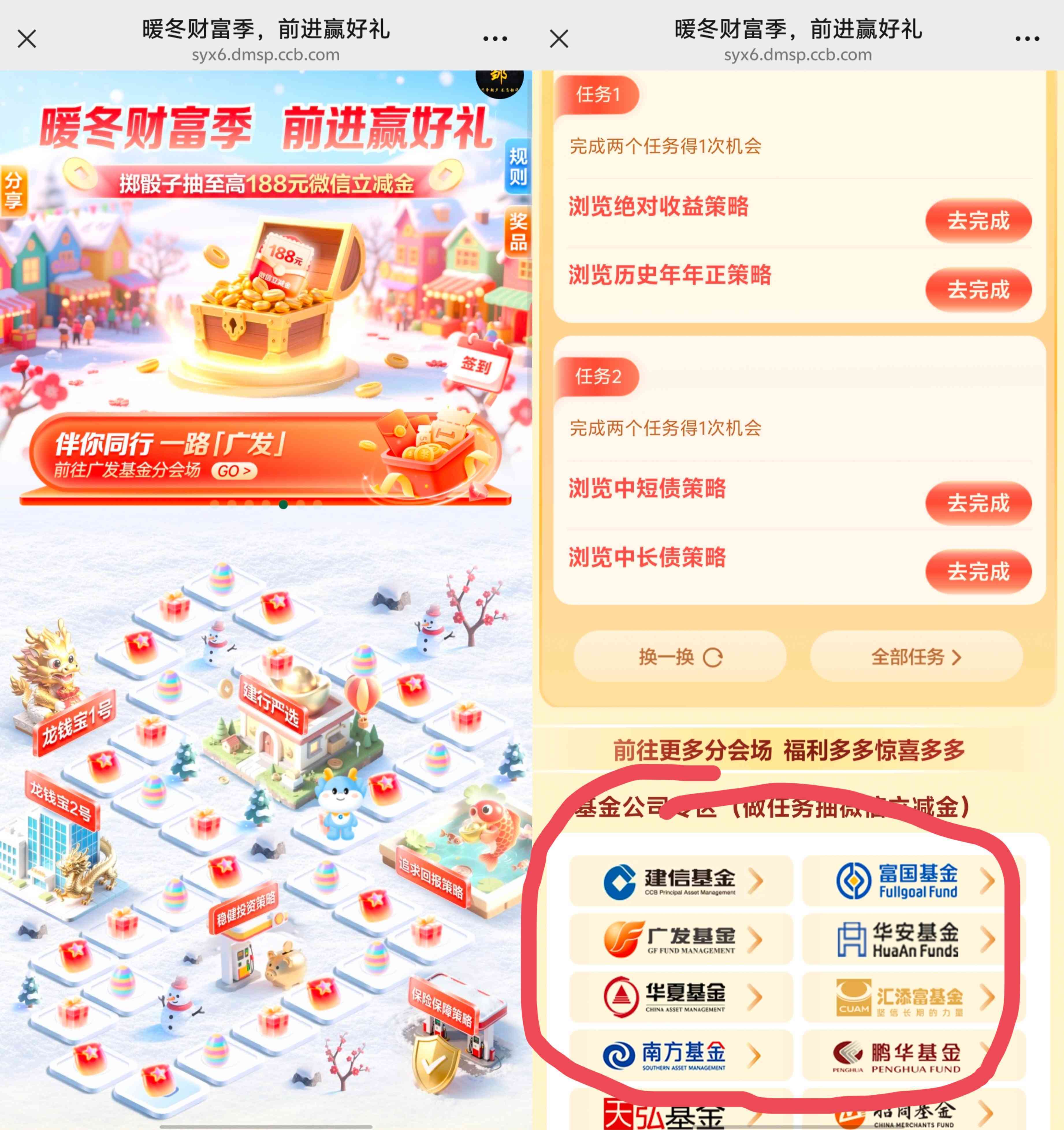 建设银行的暖冬财富季前进赢好礼的活动,参加活动进入需要完成页面任务获得投骰子前进的机会,每完成两个任务可获得一次机会,活动前面介绍过,现在又上了新任务可继续参加,每天每人限投三次骰子前进三次抽奖三次,抽奖非必中微信立减金,可能是中CC豆,这个得看运气,另外活动页面下方的基金场所有的基金号都可以点进去看看,大部分也都有抽奖任务,也是微信立减金