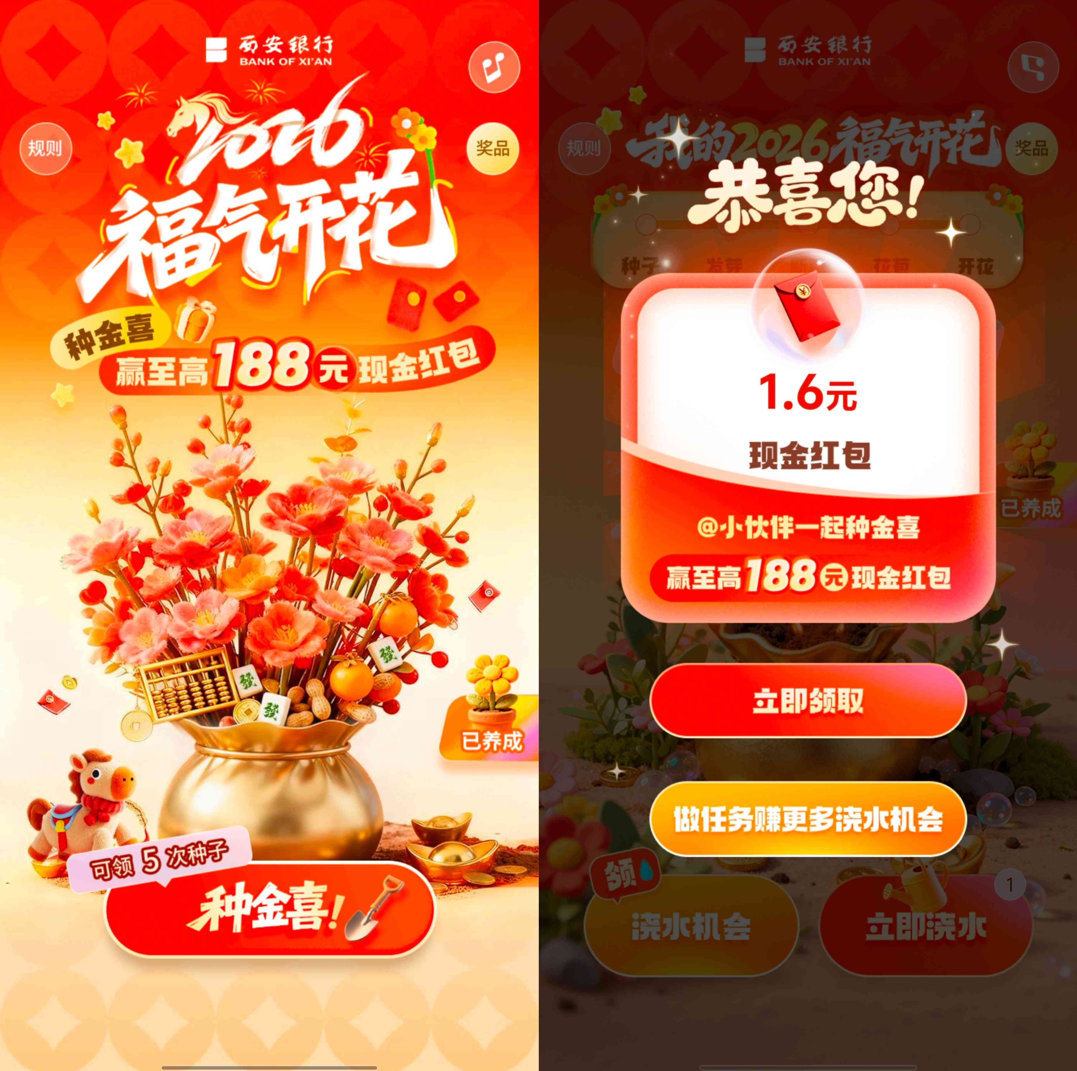 西安银行的2026福气开花种金喜赢至高188元现金红包的活动,活动是不限地区,也不需要有它家的卡,并且也不需要注册,只需要关注公众号就可以,活动种金喜是需要给种子浇水,首次进入活动就有三次浇水的机会,如果当地有西安银行的加一下客服企微号可获得三次浇水机会,没有的就需要用自己两个小号助力两次可获得两次浇水,种子浇水五次可结果抽奖一次,奖品为1.6~188元的微信现金红包,红包是直接推送到公众号,基本秒推,注意领取