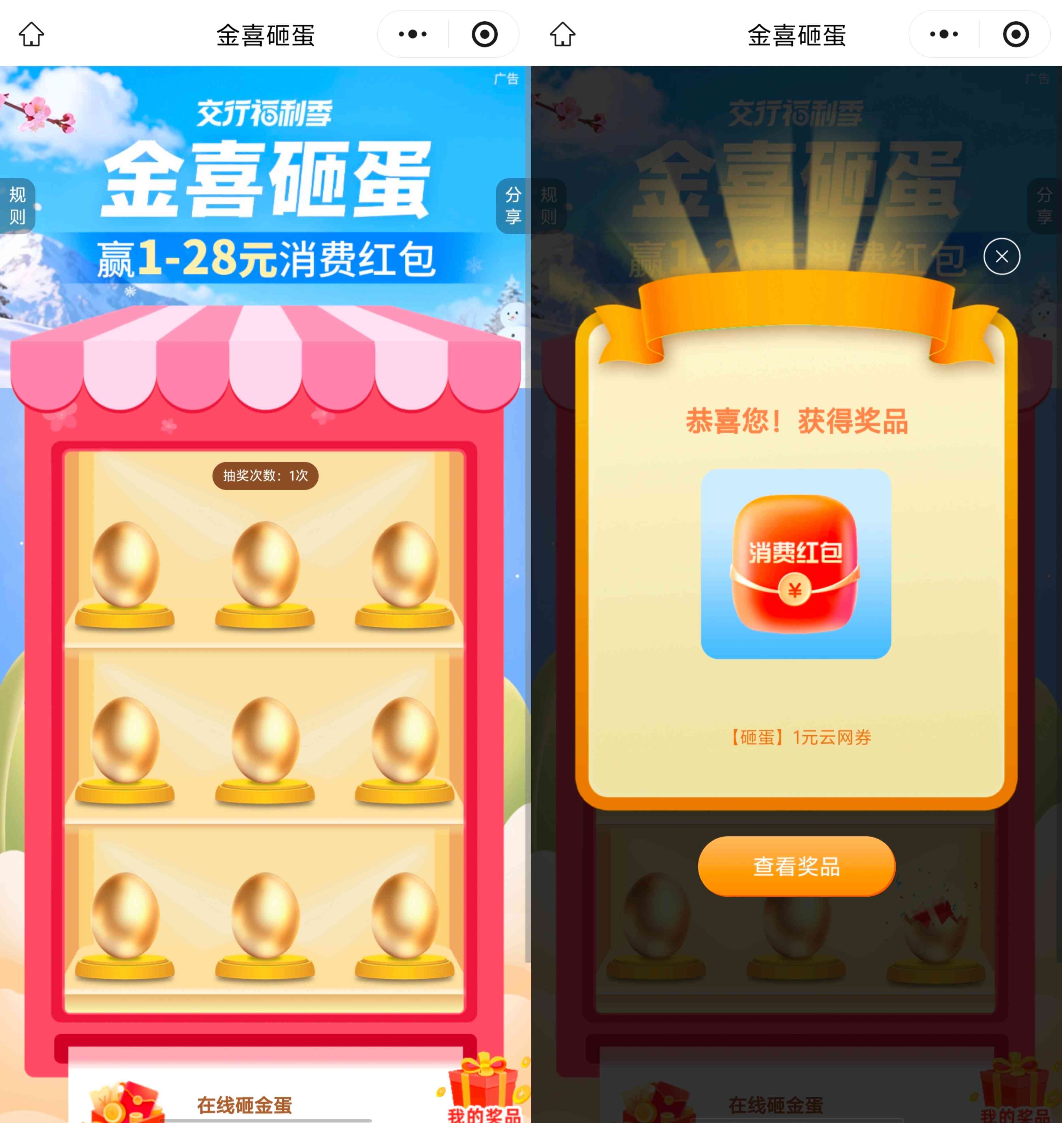 交通银行微信小程序的金喜砸蛋的活动,参加活动进入需要先在活动页面使用交行开卡信息报名后可抽奖一次,奖品为1~28元的支付贴金券,这个需要使用交通银行APP线下扫码支付可立减,有兴趣的可以看看