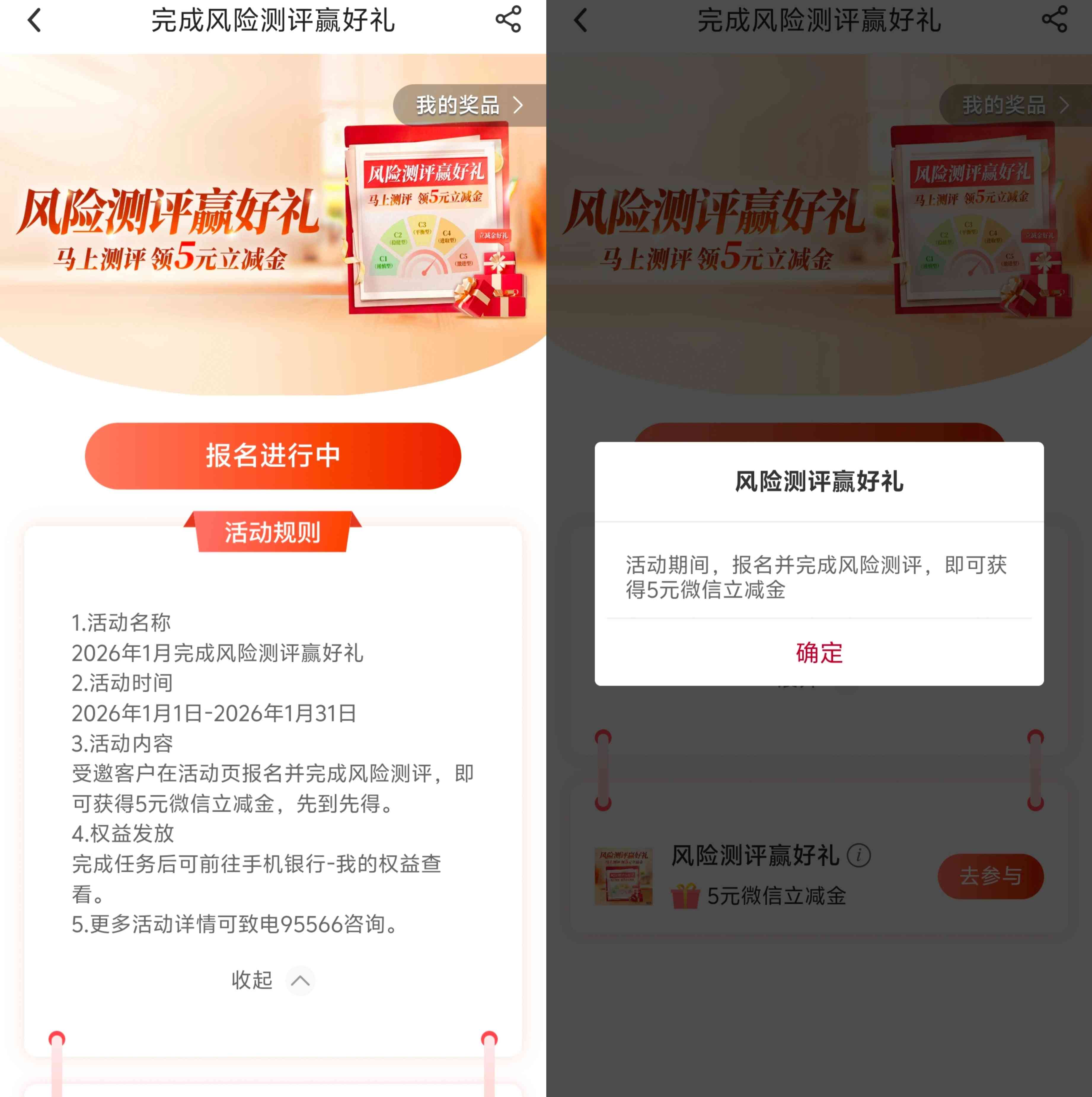 中国银行的风险评测赢好礼的活动,活动限部分用户参加,应该是没有在有效期的风险评估报告的用户能参加,参加活动进入完成风险评估后可领取5元的微信立减金,有中国银行账户的用户可以看看能不能参加