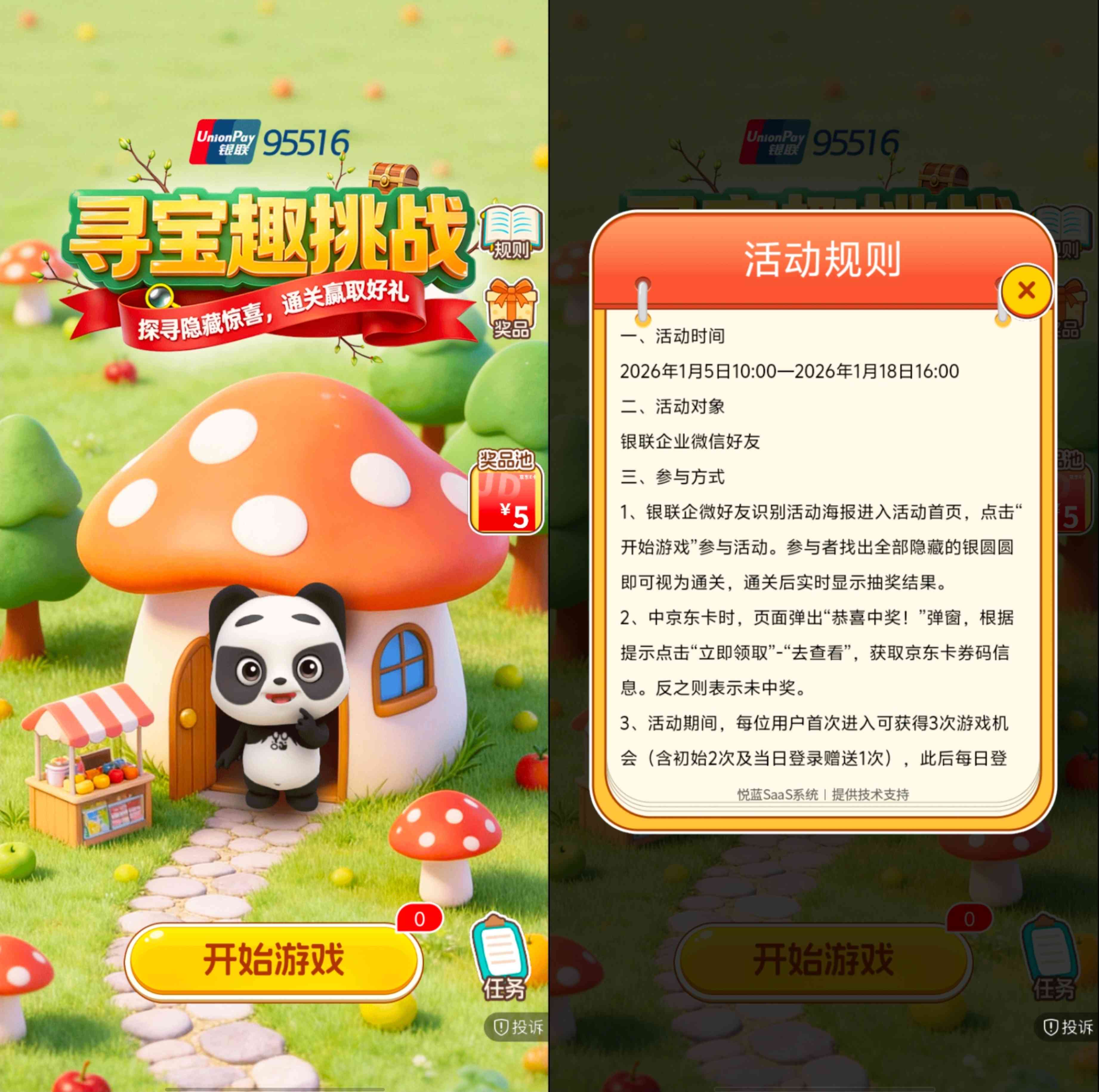 中国银联的寻宝趣挑战的活动,参加活动首次进入有三次找银圆圆的机会,后续每天进入是一次,所谓的银圆圆就是熊猫头,每次挑战有6个熊猫头,全部找出点击后可抽奖一次,奖品为5元京东E卡,E卡可在闲卡宝微信公众号卖出变现,5元卡售价4.5元,抽奖非必中