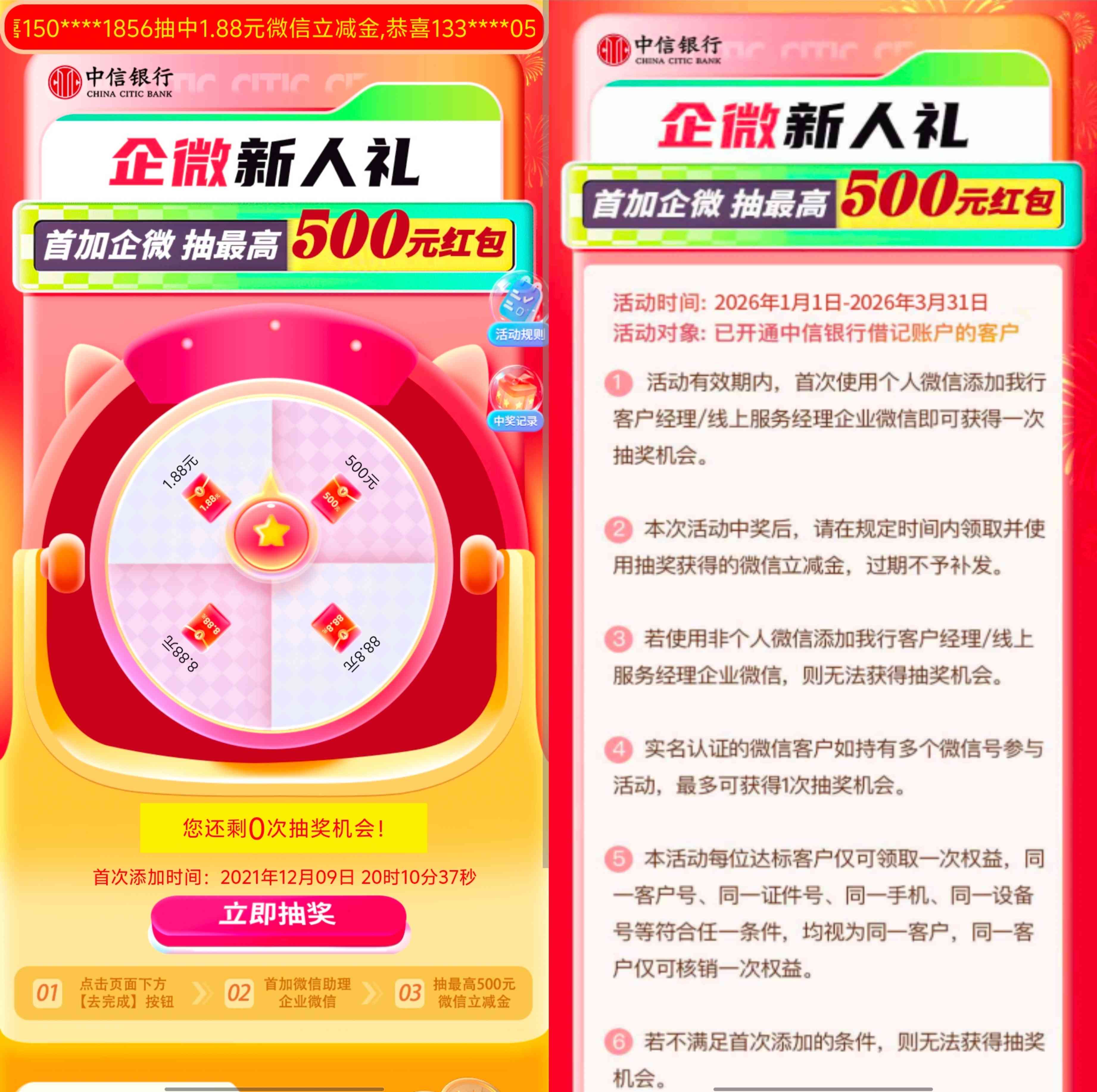 中信银行新一期的企微新人礼的活动,活动限以前从没添加过他行企业微信的用户参加,参加活动进入只需要根据活动提示完成添加他家的客户经理企业微信号后就可以抽奖一次,奖品为1.88元、8.88元和最高500元的微信立减金,抽奖必中,有中信银行账户的用户可以看看