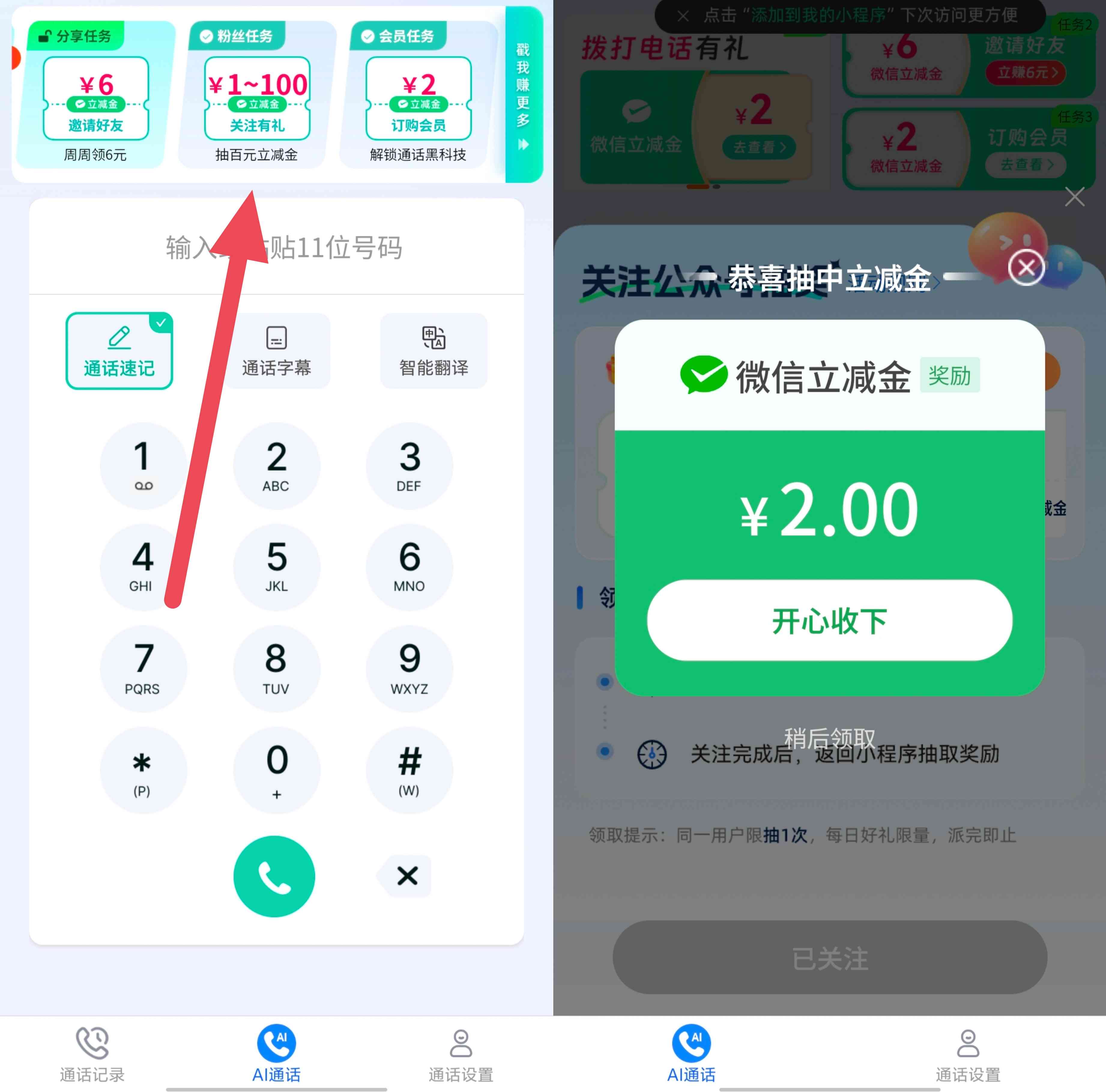 中国移动的AI通话微信小程序抽微信立减金的任务,以前介绍过一次,使用AI通话功能拨打电话对方接听后可获得2元微信立减金,0元订购会员也可以领取2元微信立减金,现在新上线了关注公众号和复拨有礼两个任务,首次关注对应公众号后可获得一次抽取最高100元微信立减金的机会,至于复拨有礼是需要连续10天使用AI通话拨打电话可获得一共8元的微信立减金,中国移动用户可以参加一下