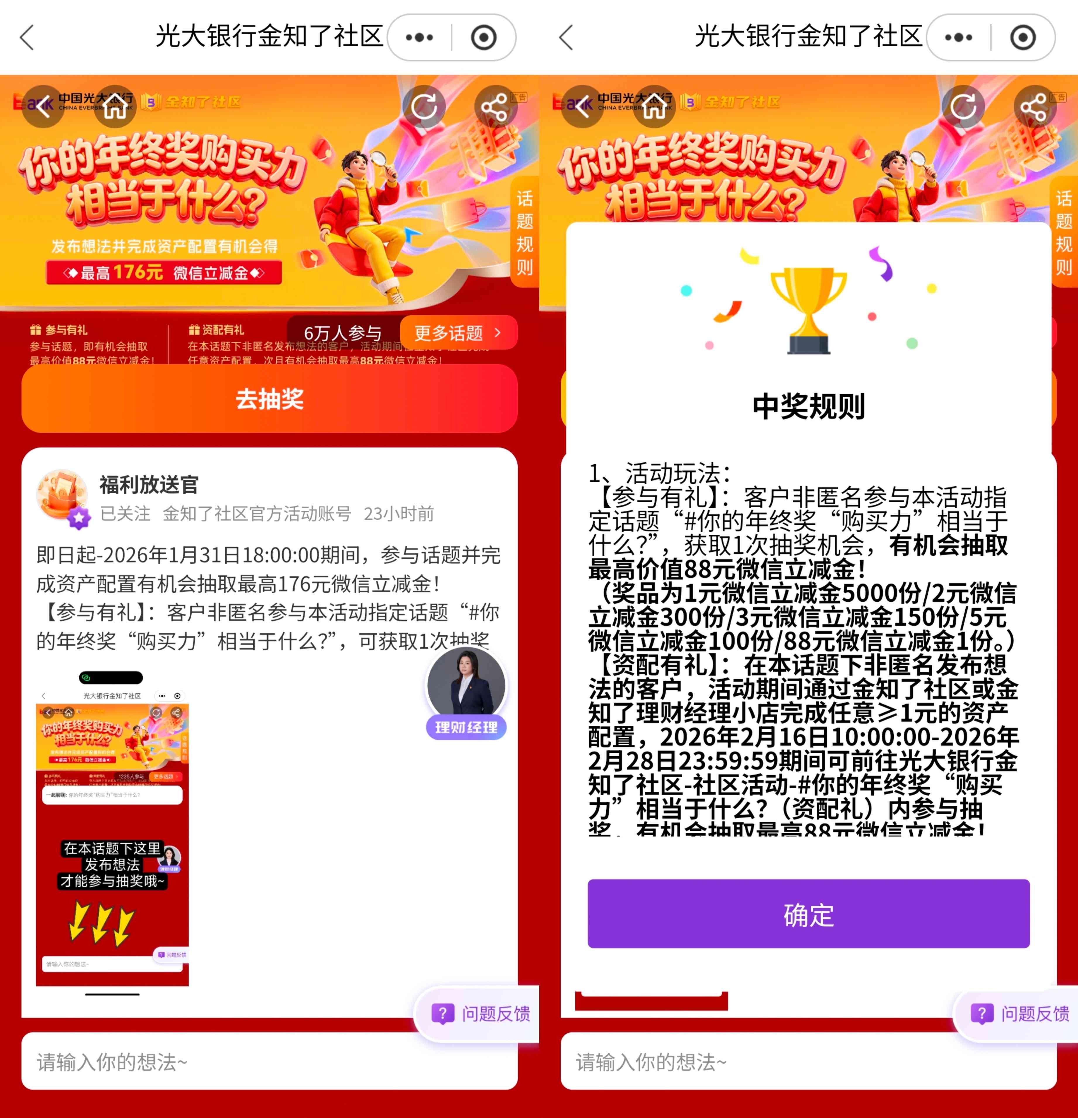 光大银行年末的话题讨论抽奖的活动,这次的主题是年终奖的购买力,话说我们苦逼底层一个,哪里领过年终奖,不过不影响我们参加活动,参加活动进入需要先发表讨论后页面才会有抽奖入口,可以随便写几个字,奖品为1~88元的微信立减金,抽奖非必中,有光大银行卡的可以试试运气