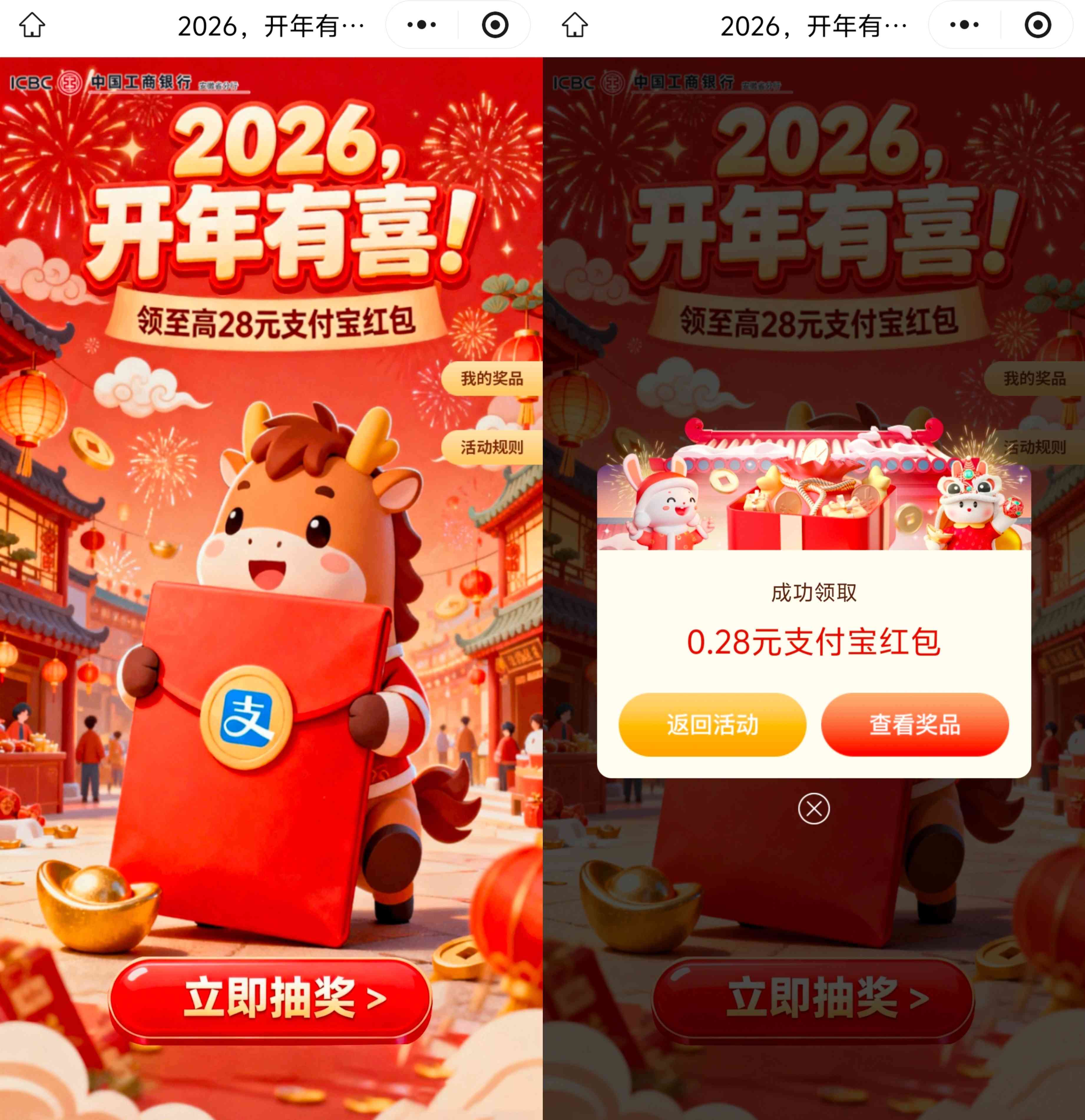 工商银行的2026开年有喜领至高28元支付宝红包的活动,参加活动进入可直接参加抽奖一次,奖品是最高28元的支付宝立减金,我是抽中的0.28元,不嫌少的工行用户可以试试运气