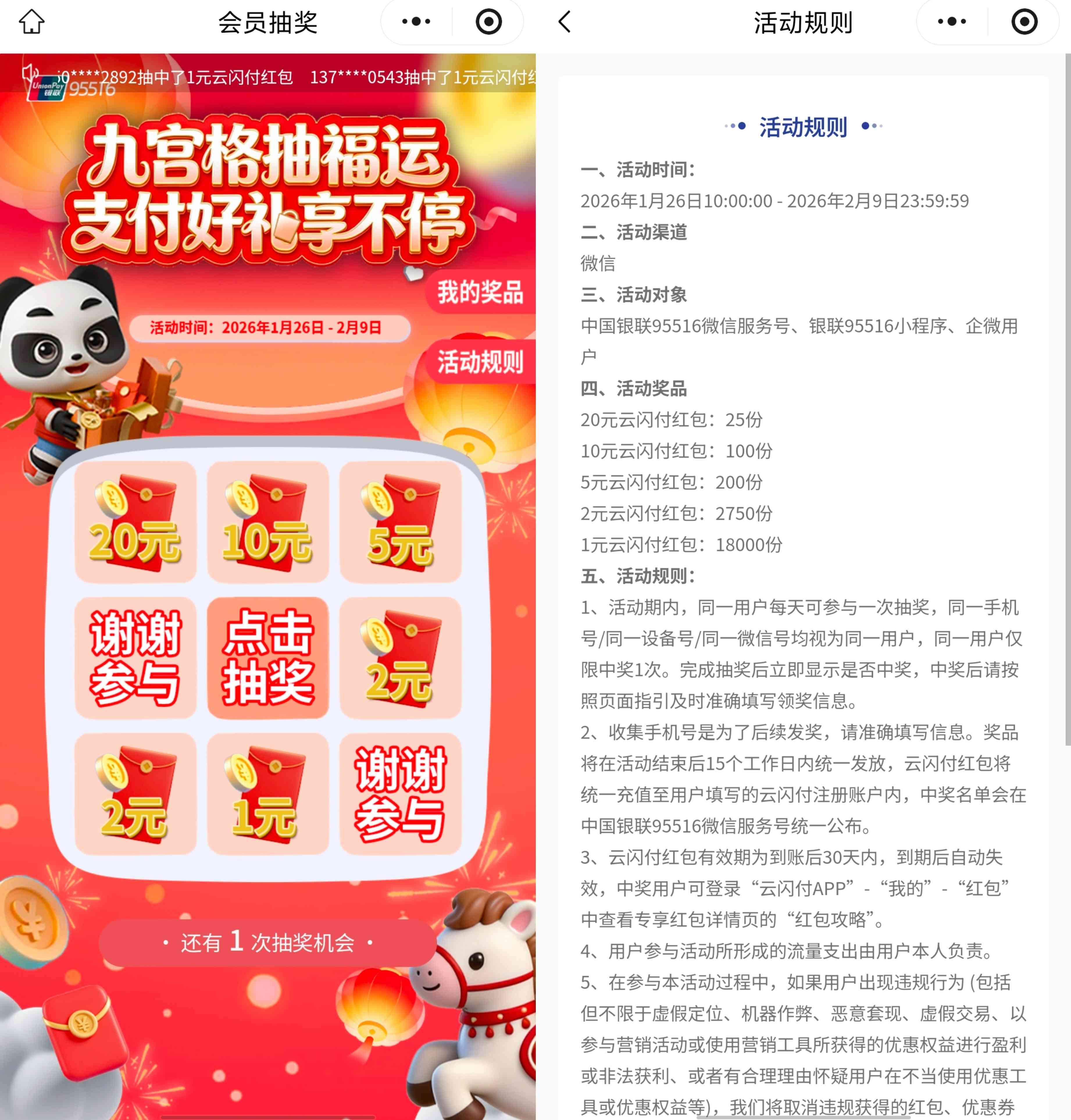银联旗下支付平台云闪付的九宫格抽福运支付好礼享不停的活动,每用户参加活动进入可直接参加抽奖一次,奖品为1~20元的支付立减金,这个可以在云闪付APP中使用,线上线下通用