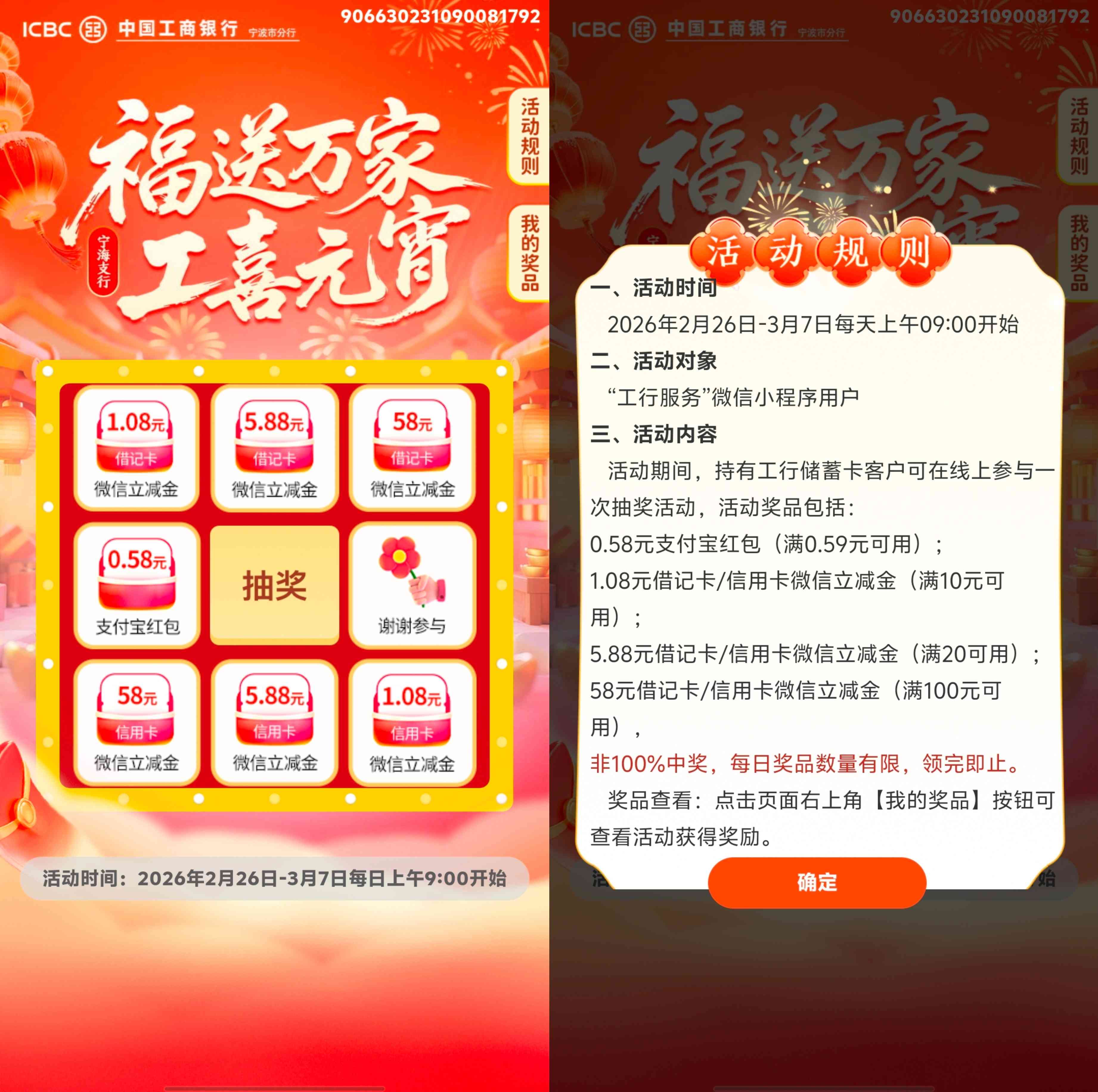 工商银行宁波分行的福送万家工喜元宵的活动,全国用户都可以参加,参加活动进入每用户可直接抽奖一次,奖品为0.58~58元微信立减金,奖品每天上午9点更新,抽奖非必中,有兴趣的可以试试运气