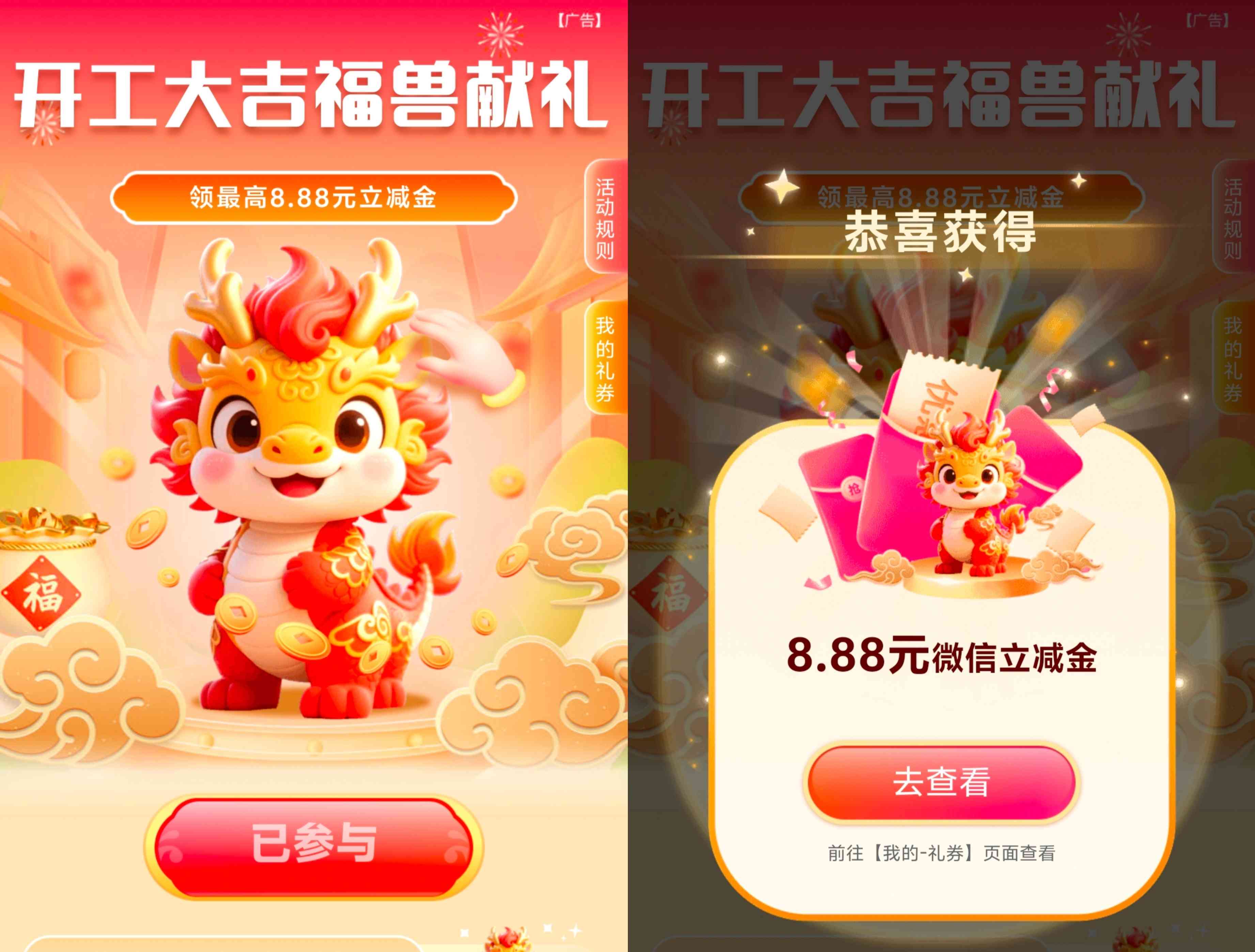 湖北农业银行的开工大吉瑞兽献礼的活动,活动限湖北农业银行的用户参加,参加活动进入可直接参加抽奖一次,奖品为3.88元、6.88元和8.88元三种面额的微信立减金,抽奖非必中,活动介绍是武汉农行的,我是鄂州的卡也能参加,具体自测