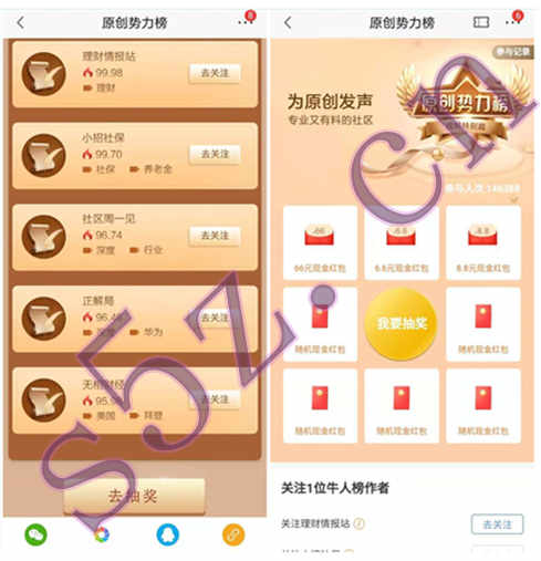 招商银行的“原创势力榜,为原创发声”活动,参加活动只需要随意关注以为作者就可以抽奖,取消再重新关注也算,奖品为0.2~66元随机现金红包,可提现,100%中奖
